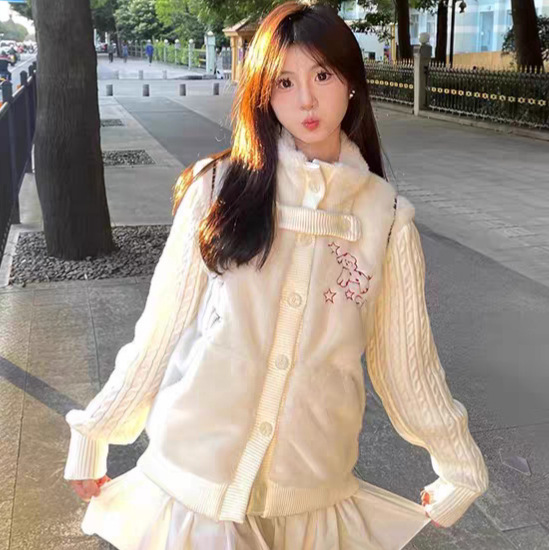 大码胖mm甜美针织拼接毛绒外套女冬季辣妹假两件软糯开衫保暖上衣
