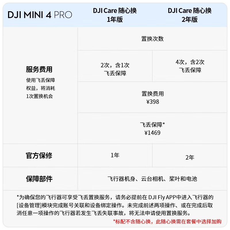 型号 | Mini 4 pro 一年版随心换-官方标配 | | 型号 | Mini 4 pro 两年版随心换-官方标配 |