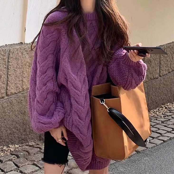 秋冬新款纯色软糯毛衣女宽松厚款麻花纯色套头慵懒风外穿针织衫