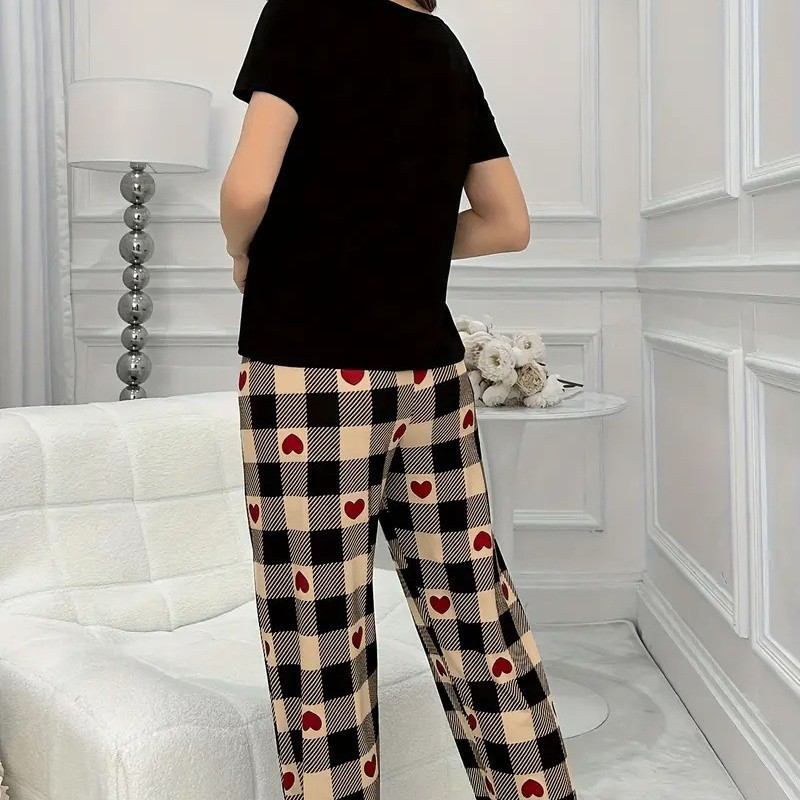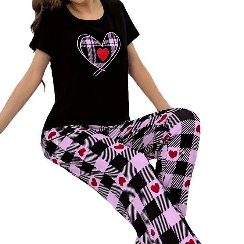 跨境欧美女式家居服圆领爱心印花短袖T恤上衣和长裤套装pod定 制