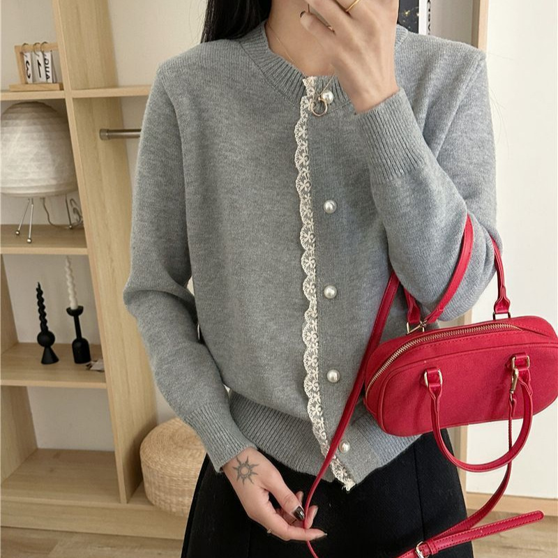 跨境货源2025年秋冬新款韩版女装时尚蕾丝拼接圆领毛衣开衫上衣女