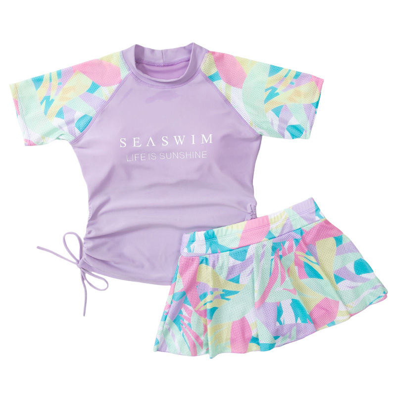 分体泳衣女跨境平角裤分体泳衣抽绳短袖保守印花运动休闲海边泳池