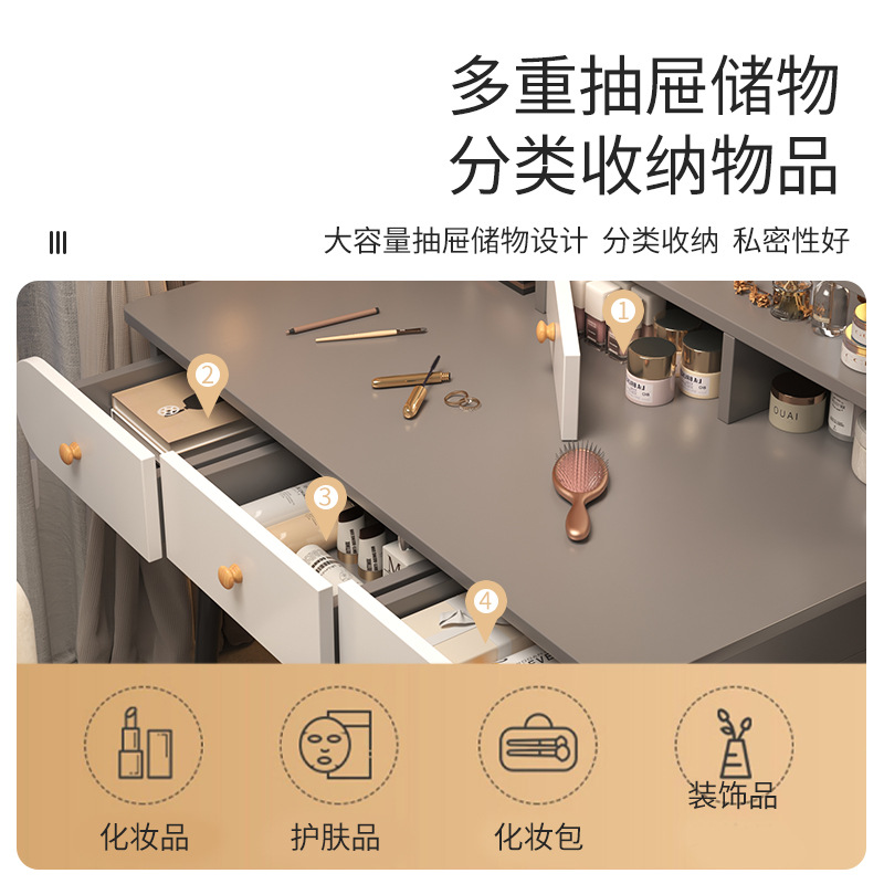 | 颜色 | 【加厚实木生态板】100CM双层三抽灰色带LED+仙女椅 | 颜色 | 80CM单层双抽灰色+仙女椅 |