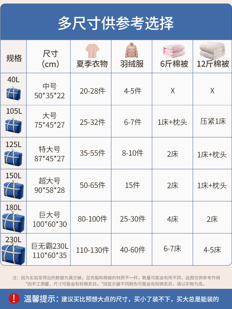 | 颜色 | 换季衣服收纳 两件套 藏青色 125+105 | 颜色 | 被褥收纳 两件套 藏青色 150+125 |