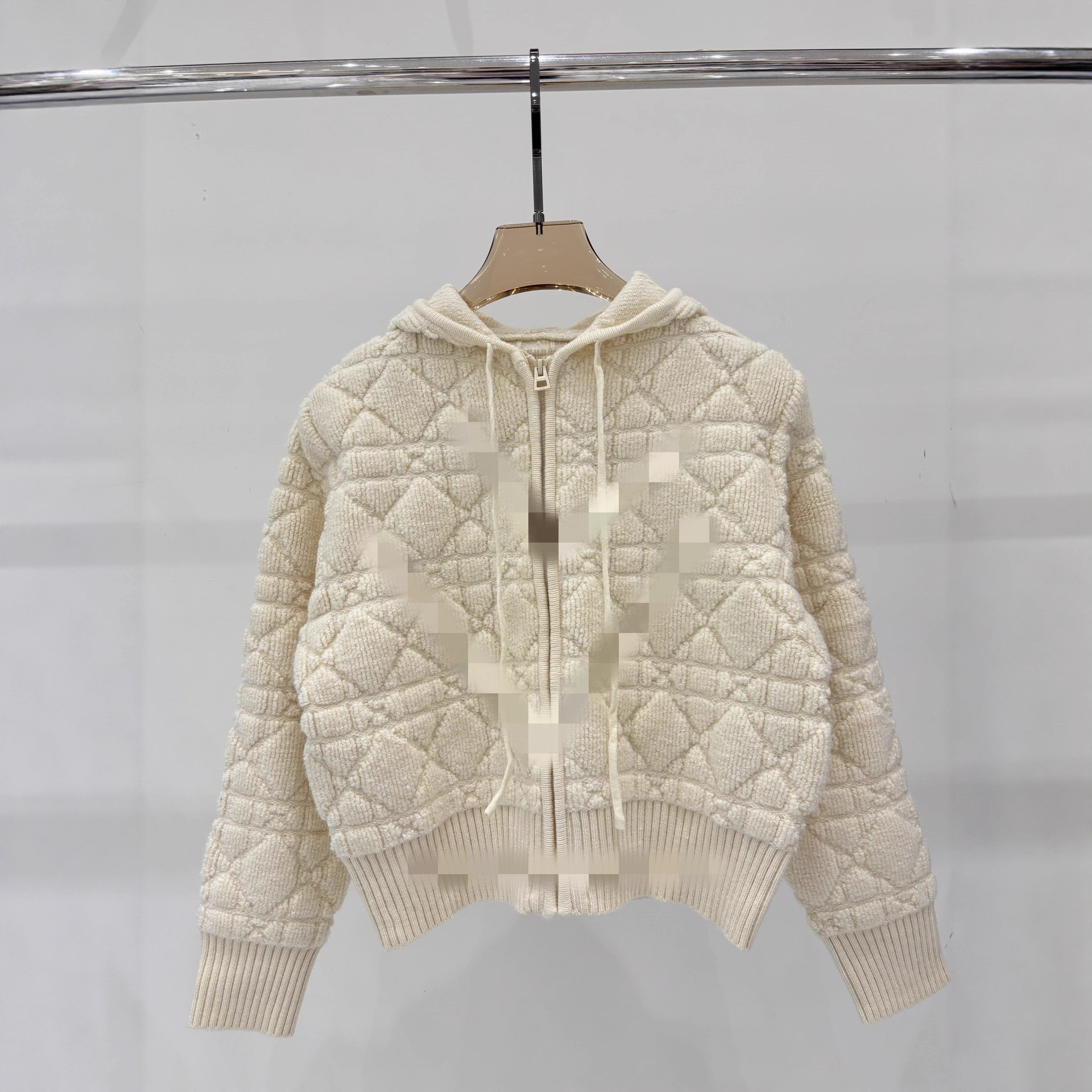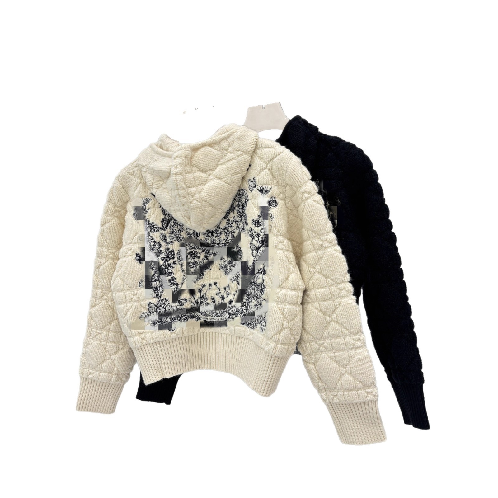 D家高版本25早秋新款格纹蝴蝶刺绣拉链长袖帽子款针织开衫外套