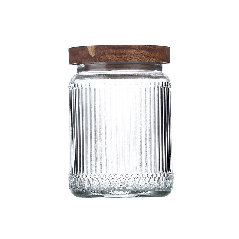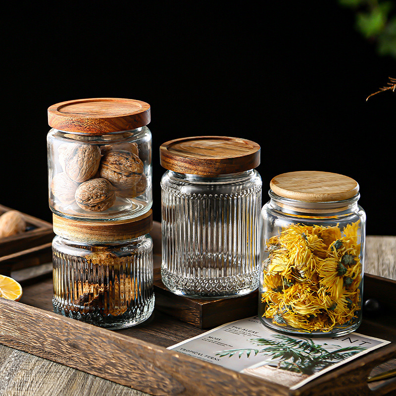 条纹木盖食品级储物罐大号玻璃密封瓶圆形中式厨房收藏透明储物罐