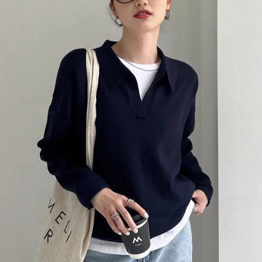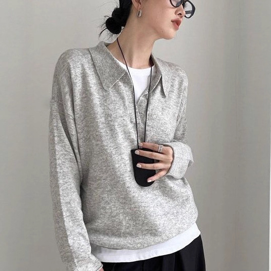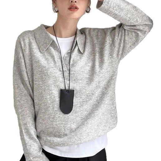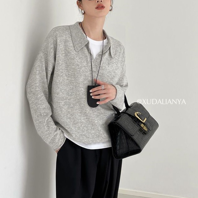 M1U老钱风polo针织衫春秋澳洲羊毛长袖宽松毛衣女