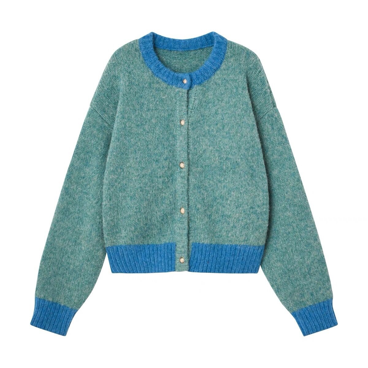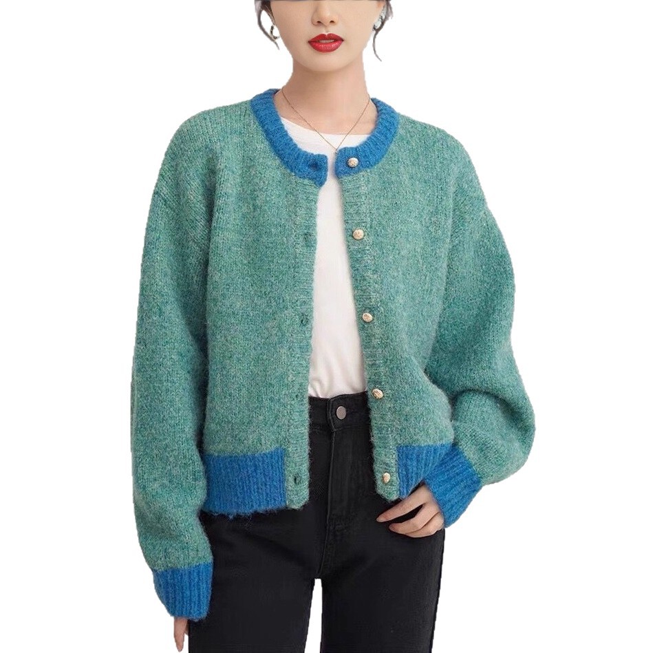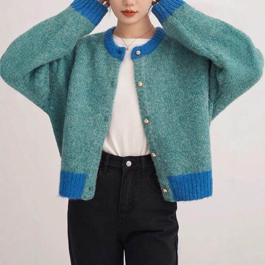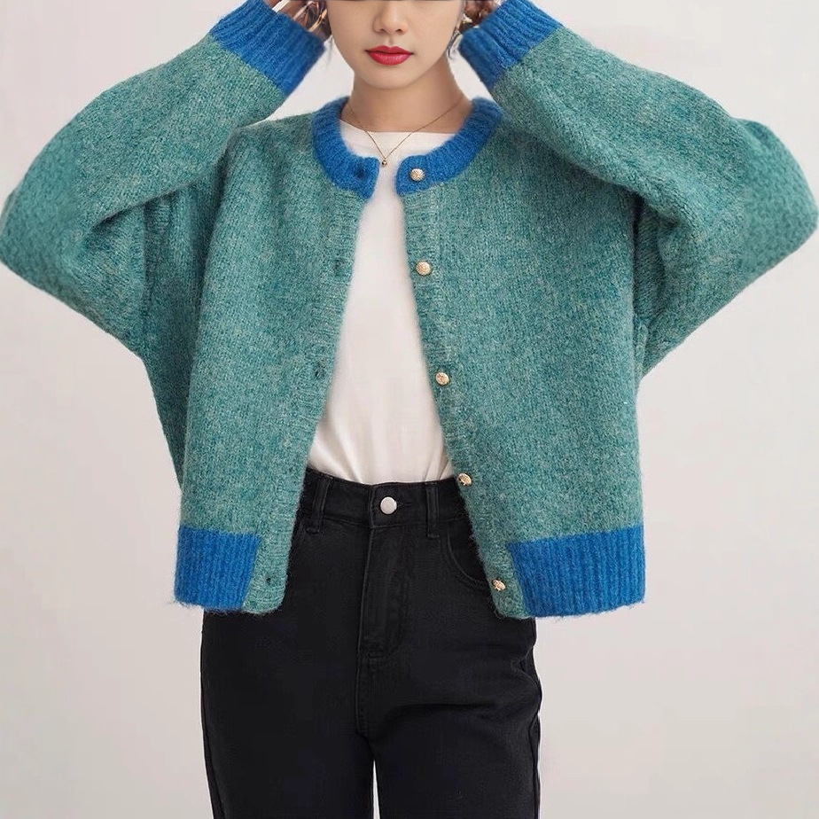 撞色圆领软糯针织外套女秋季慵懒风减龄百搭气质短款毛衣