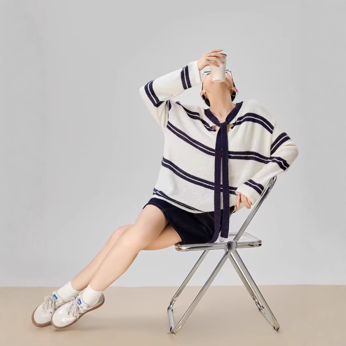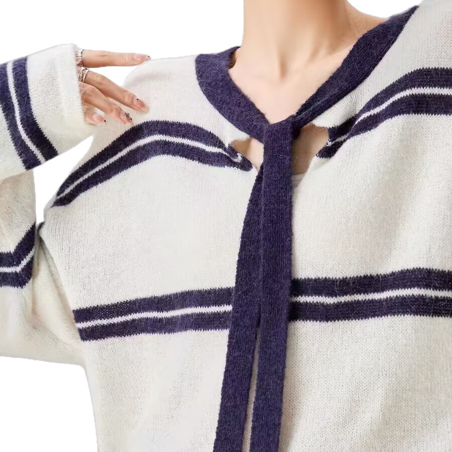 前后两穿马海毛撞色条纹系带长袖针织衫上衣女韩系早秋季穿搭小众