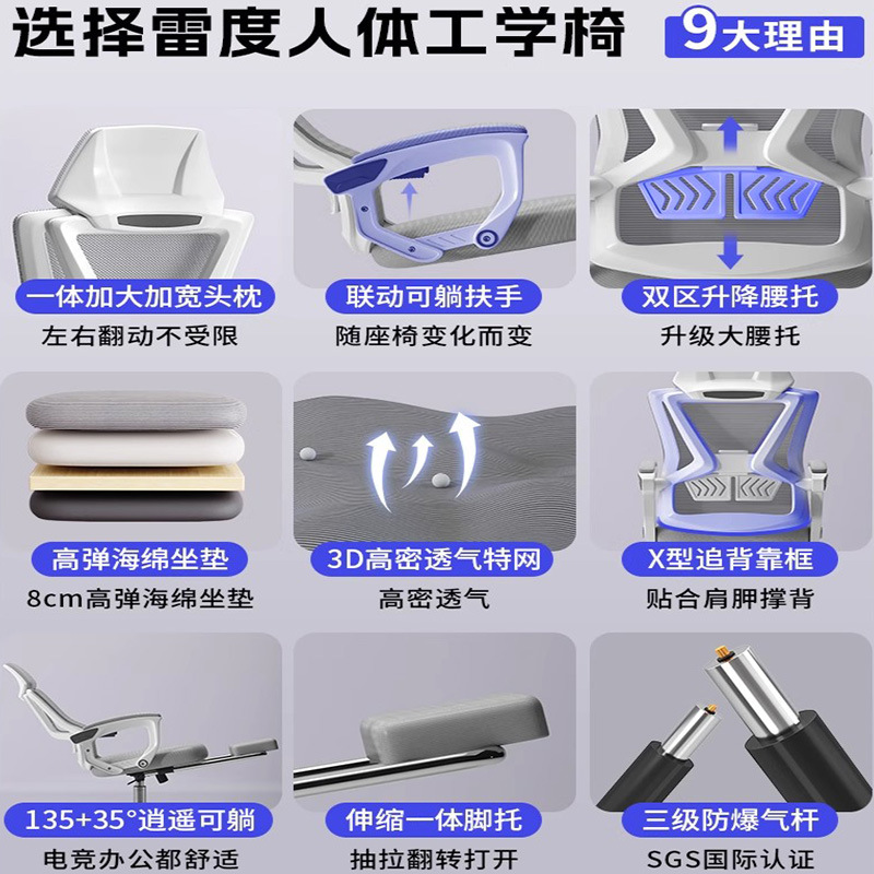 颜色 | 白框灰网+135度后仰可躺+加大加宽人体工学头枕+双区升降腰托+8cm乳胶坐垫 | | 颜色 | 黑框黑网+135度后仰可躺+加大加宽人体工学头枕+双区升降腰托+可躺搁脚+8cm乳胶坐垫 |