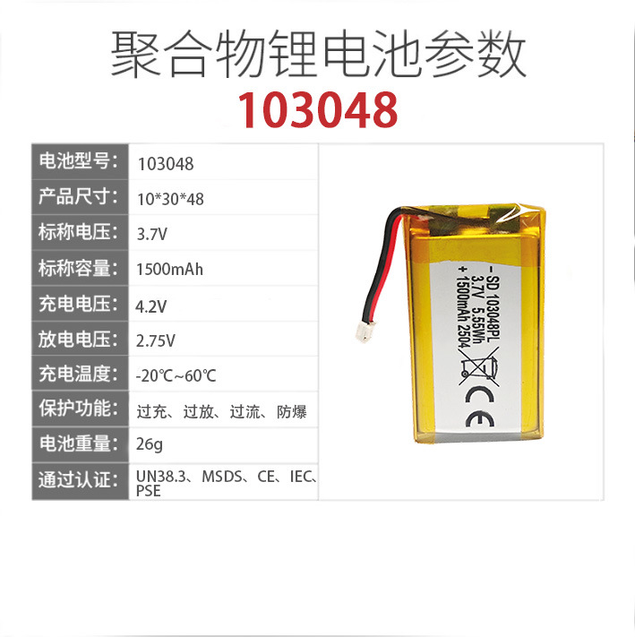 聚合物锂电池3.7V手持风扇话筒麦克风103048—1500mAh香薰机电池