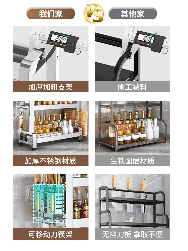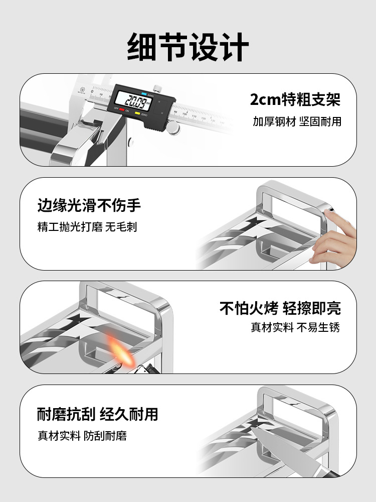 | 层数(规格) | 【304不锈钢·特厚特粗】角架大号三层生锈包退 | 层数(规格) | 【304不锈钢·特厚特粗】角架大号三层全套【刀架筷筒+挂钩+砧板架】 |