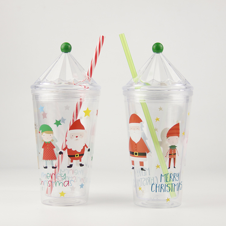 跨境 16oz圣诞杯 双层吸管杯节日水杯450ML 带吸管杯子中间插彩纸