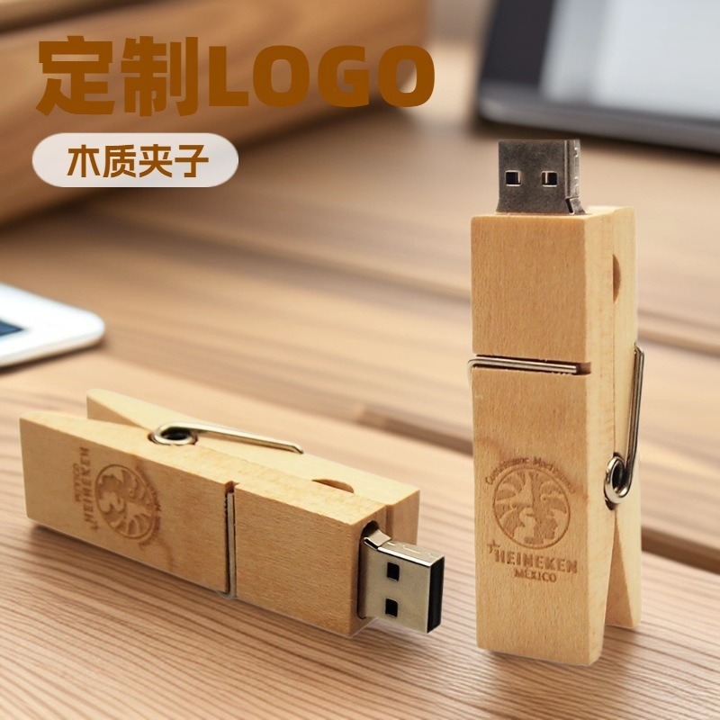 木质复古衣夹U盘 Wooden Clothespin USB 广告礼品定制刻字