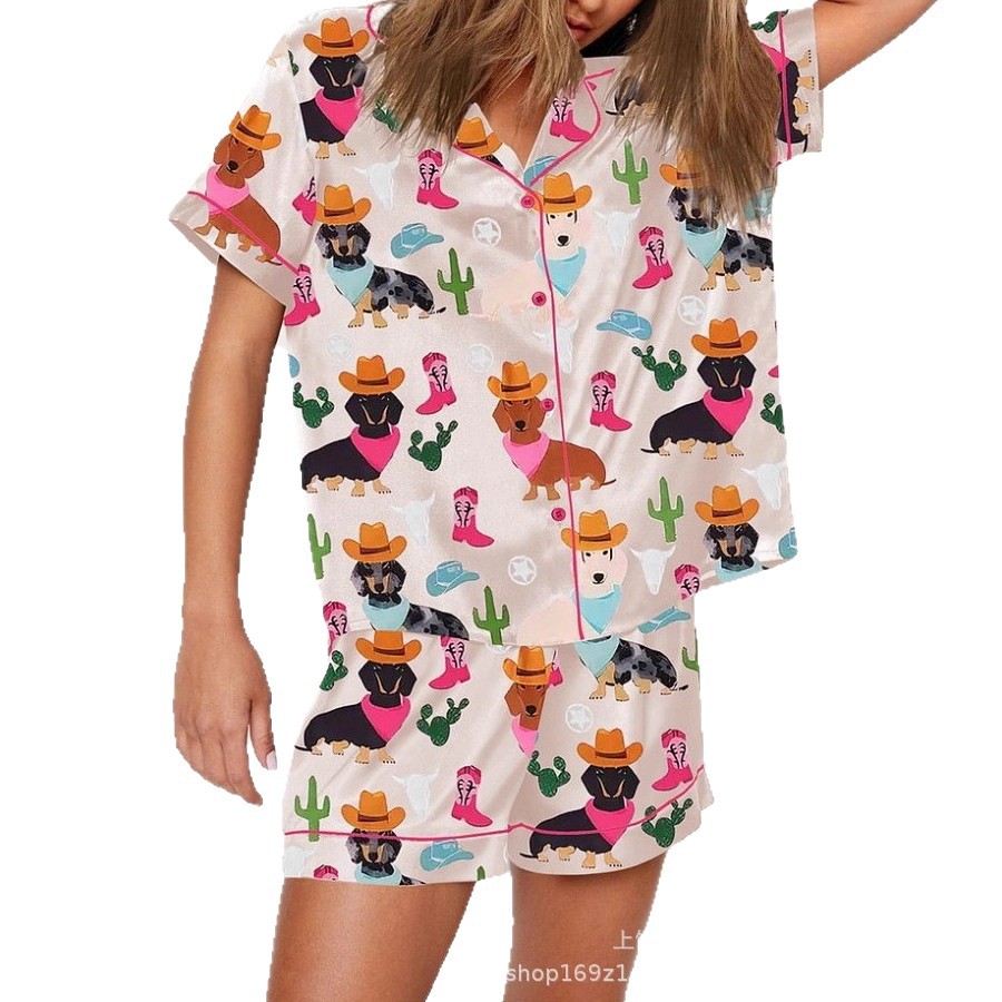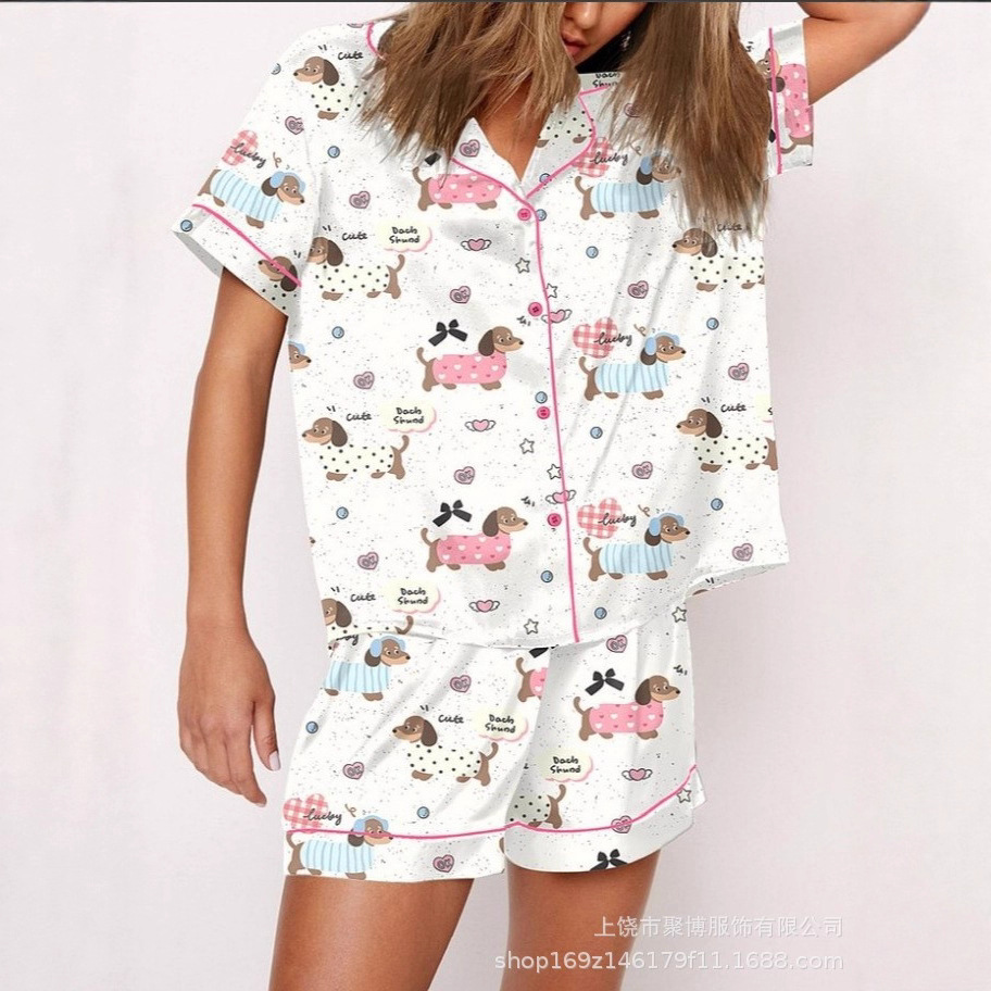 2025夏季跨境外贸卡通短袖短裤翻领女士睡衣套装3D数码印花休闲套