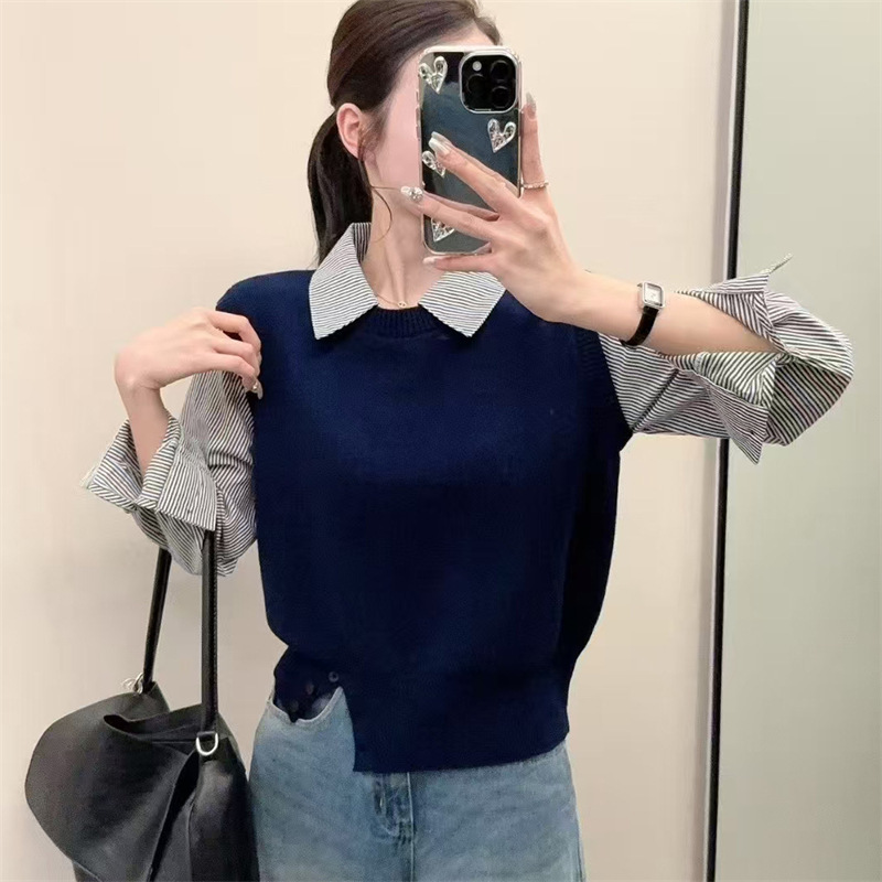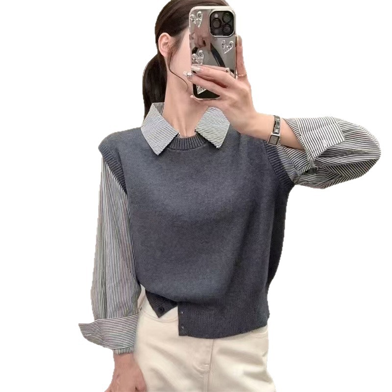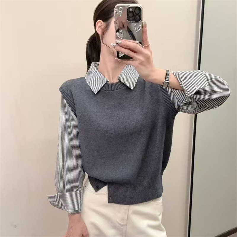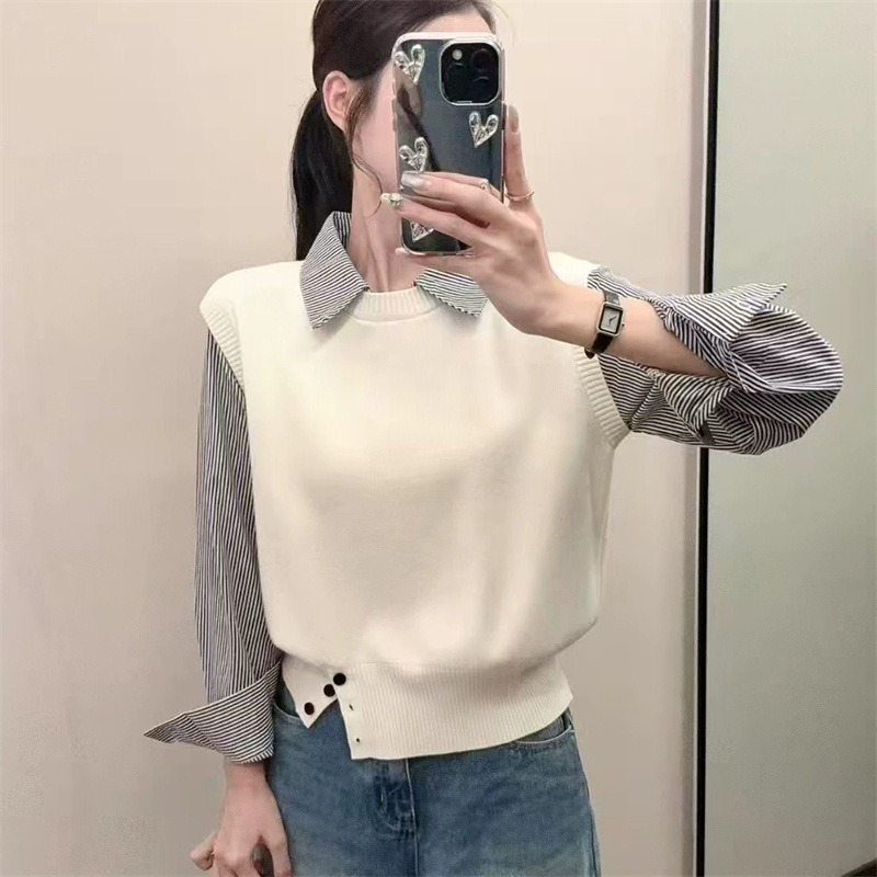 2025新款时尚百搭法式拼接假两件条纹针织衫设计感温柔风长袖毛衣