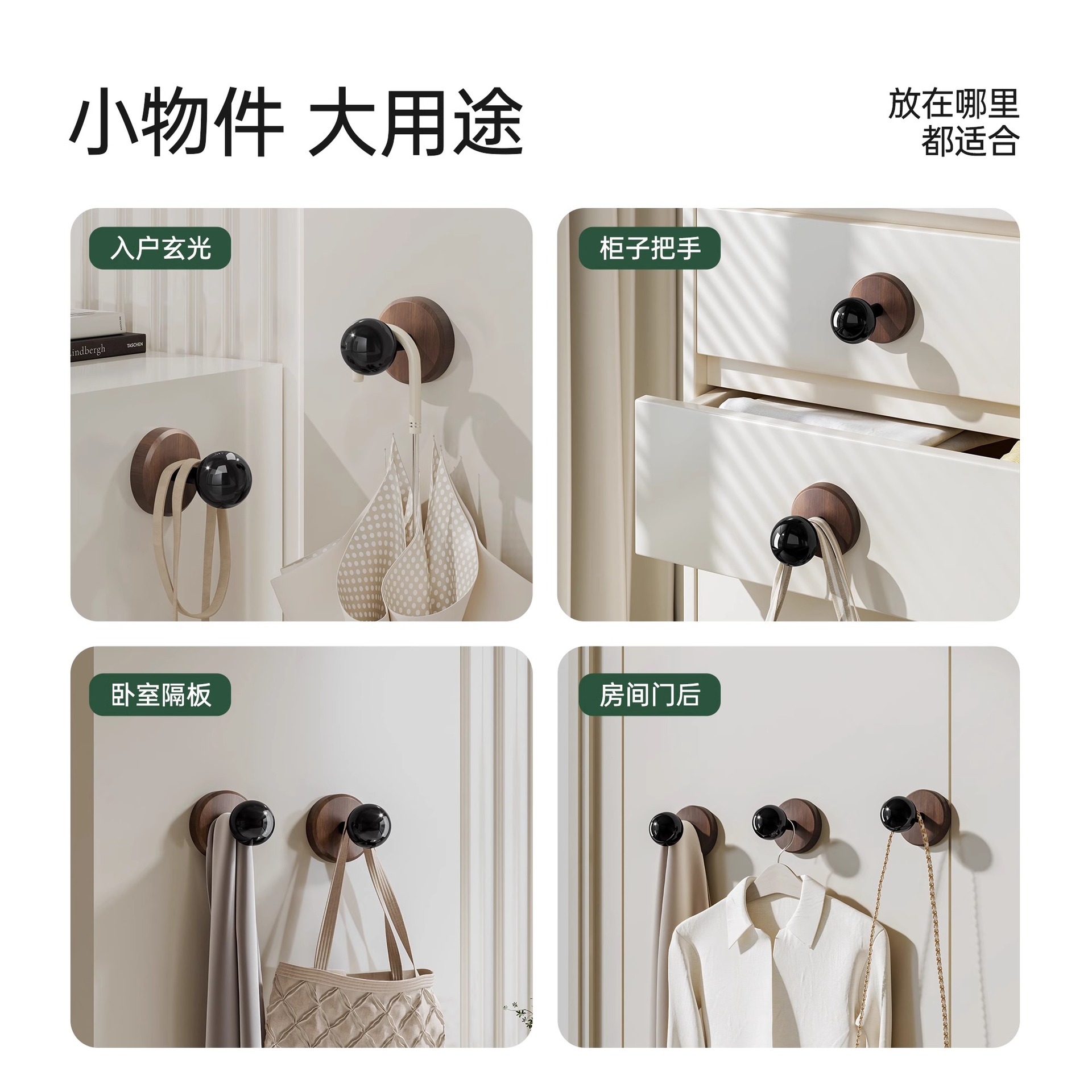 实木卫生间圆球挂钩墙钩强力贴门后木制粘钩壁挂式免打孔毛巾收纳
