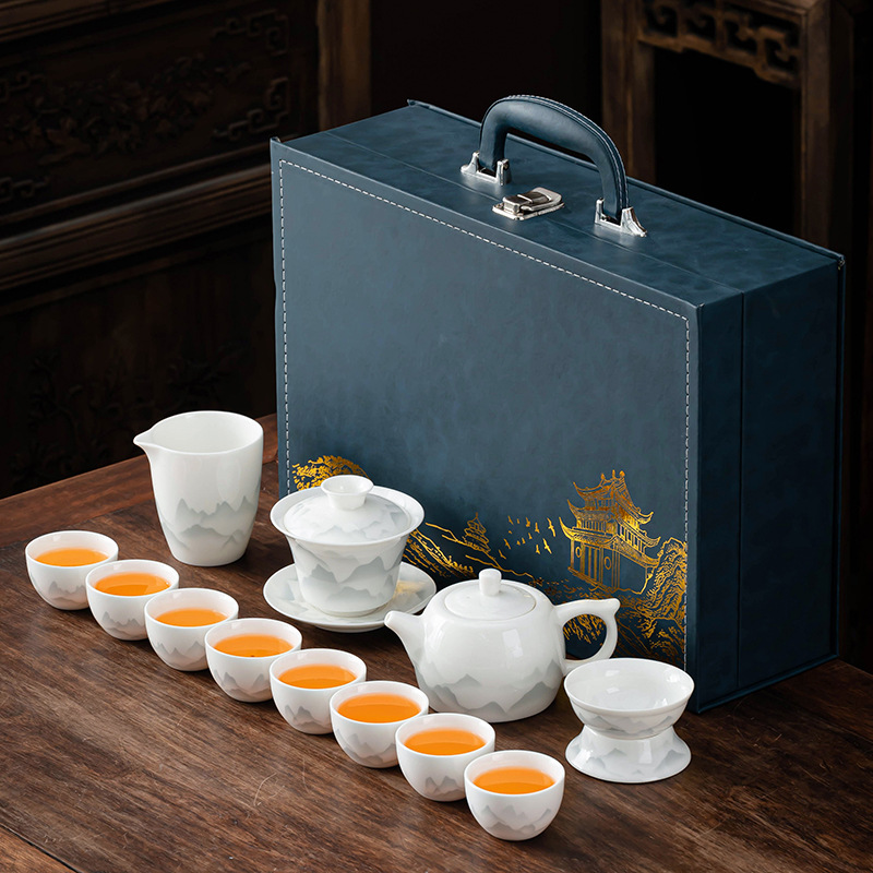 | 容量 | 羊脂玉水墨山水【井栏壶+盖碗11件套】蓝皮箱 | 容量 | 羊脂玉水墨山水【西施壶+盖碗11件套】蓝皮箱 |