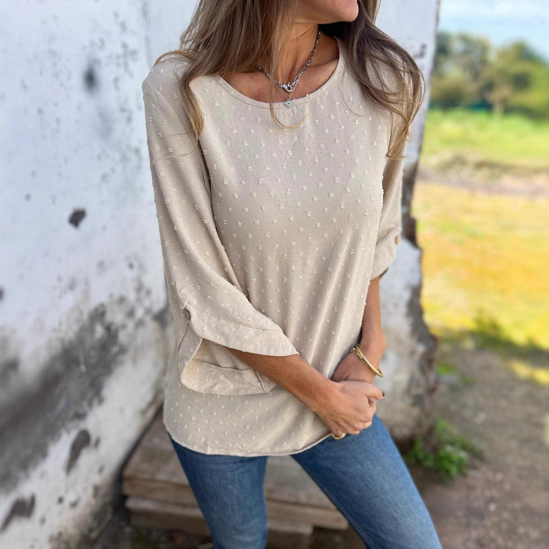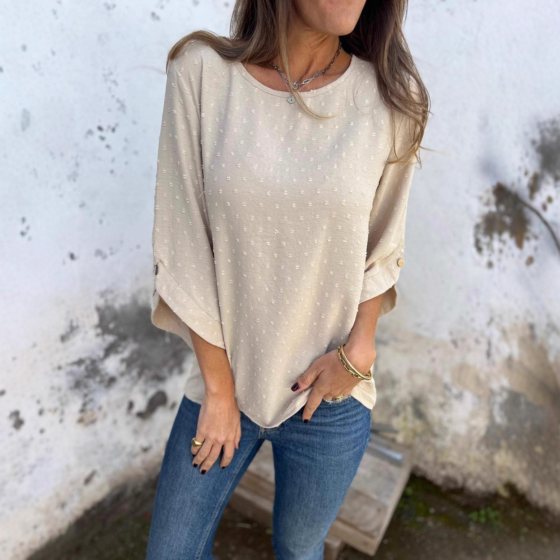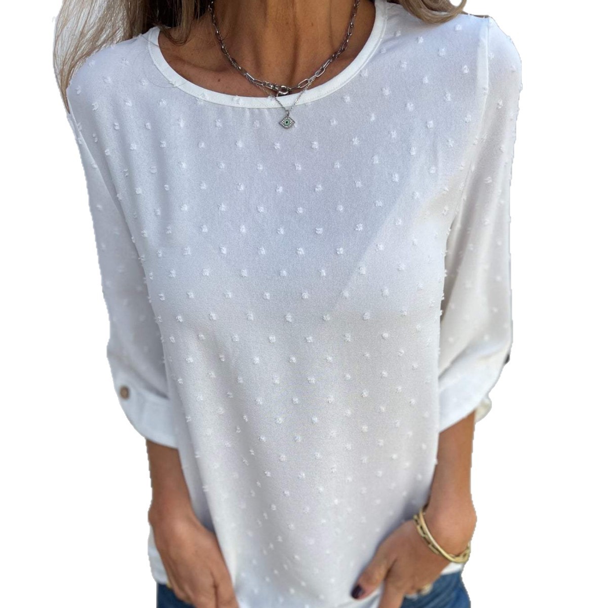 2024欧美跨境亚马逊春秋圆领雪纺提花时尚休闲宽松上衣T恤女装