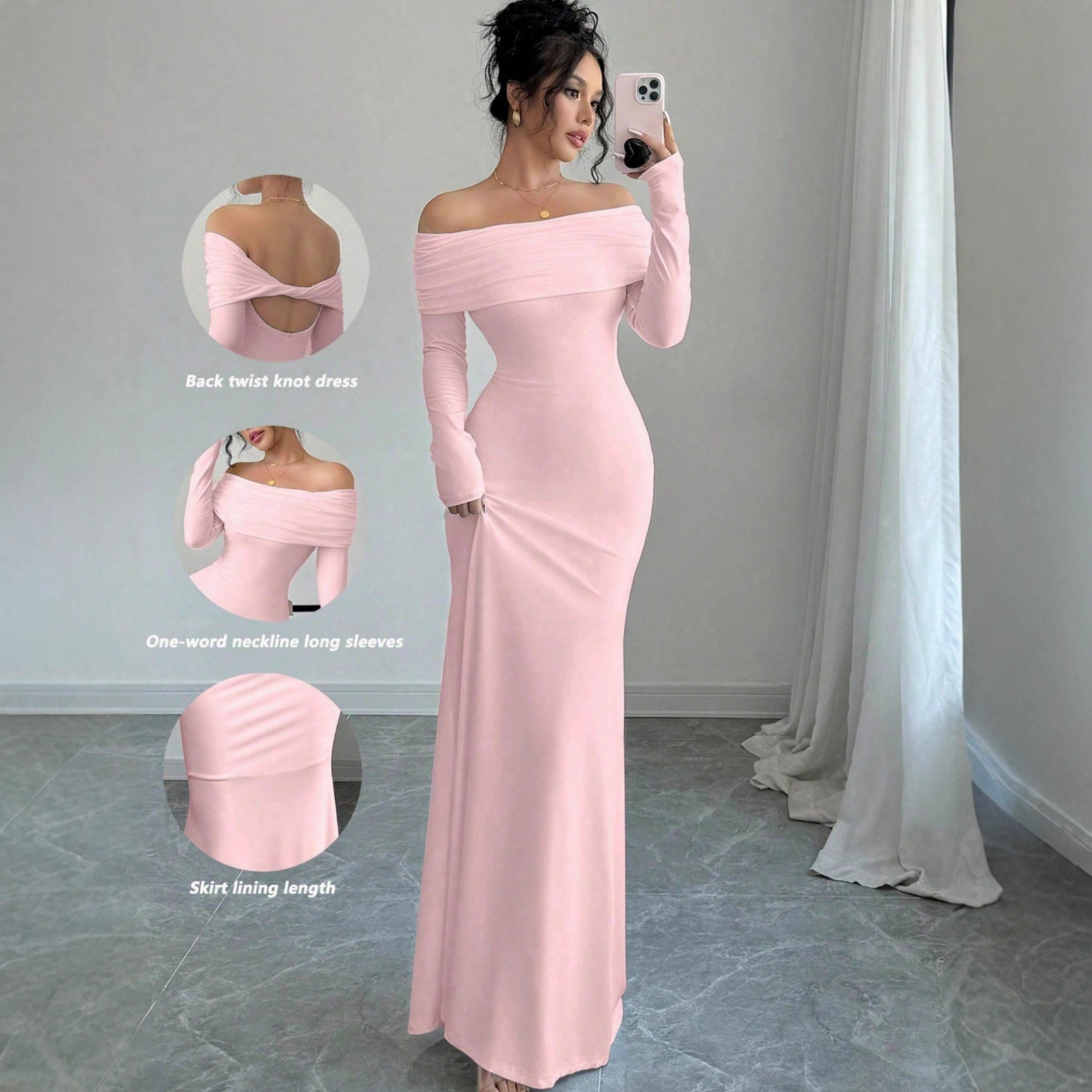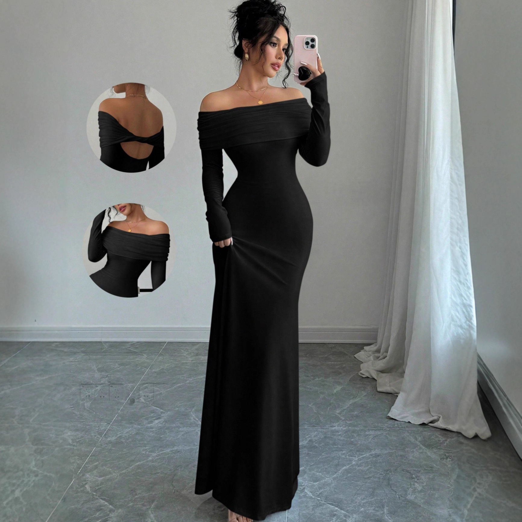 外贸2025春季女装一字露肩缩褶紧身时尚优雅包臀长款晚礼服连衣裙