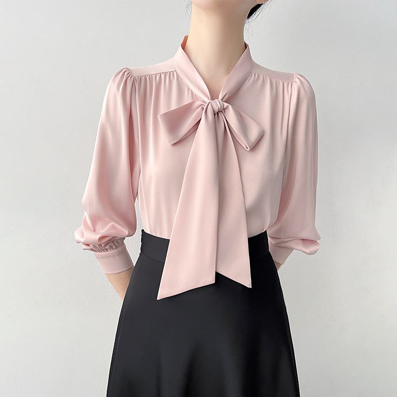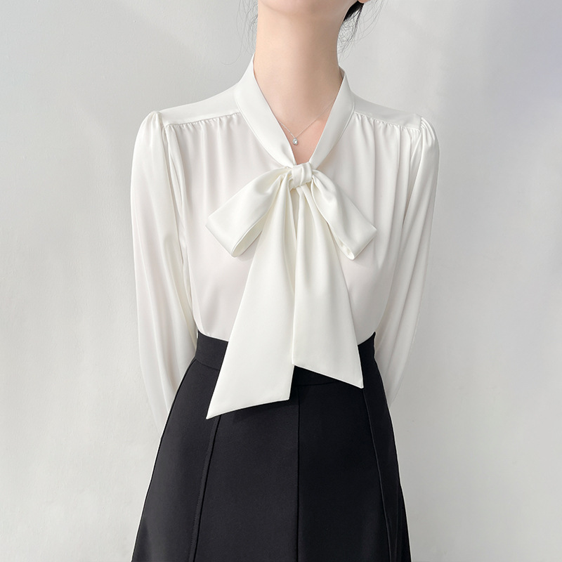 韩帛雅职业通勤面试长袖衬衫女士缎面垂感抗皱衬衣蝴蝶结飘带上衣