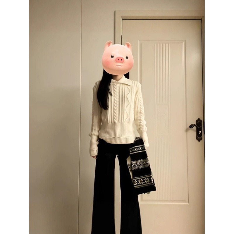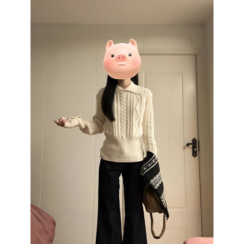 韩系翻领设计感绞花毛衣女秋冬新款下摆收腰显瘦冬季百搭针织上衣
