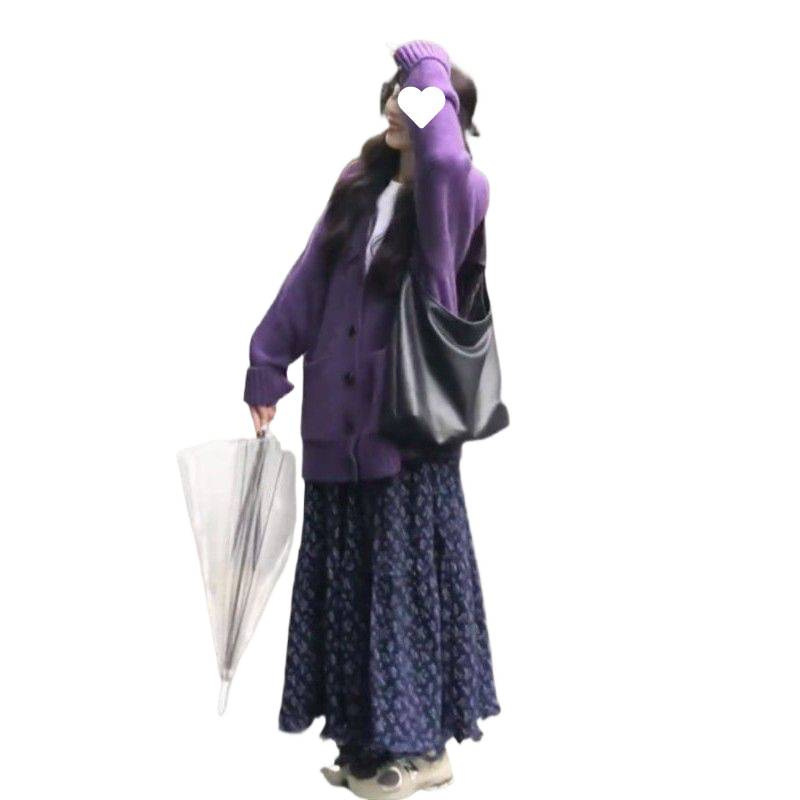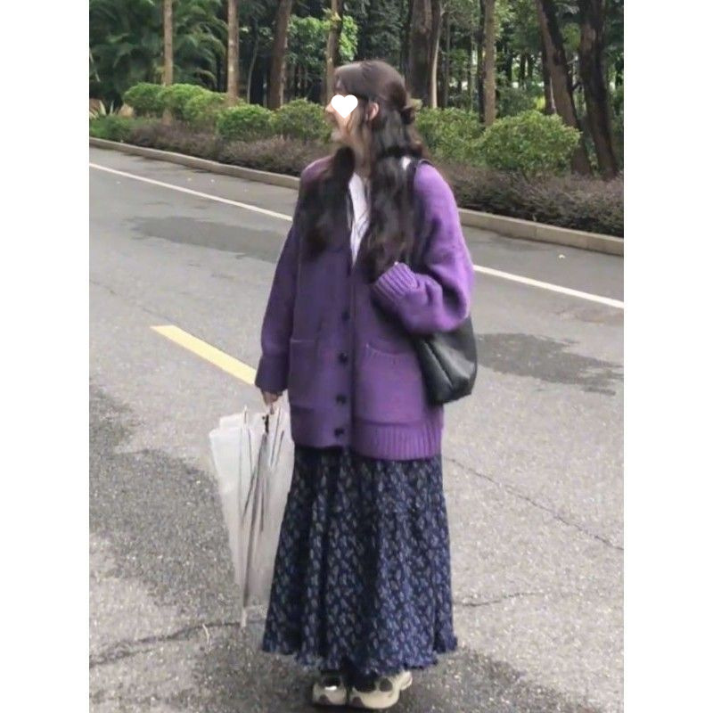 温柔慵懒风时尚套装女秋冬新款宽松毛衣开衫碎花半身裙两件套