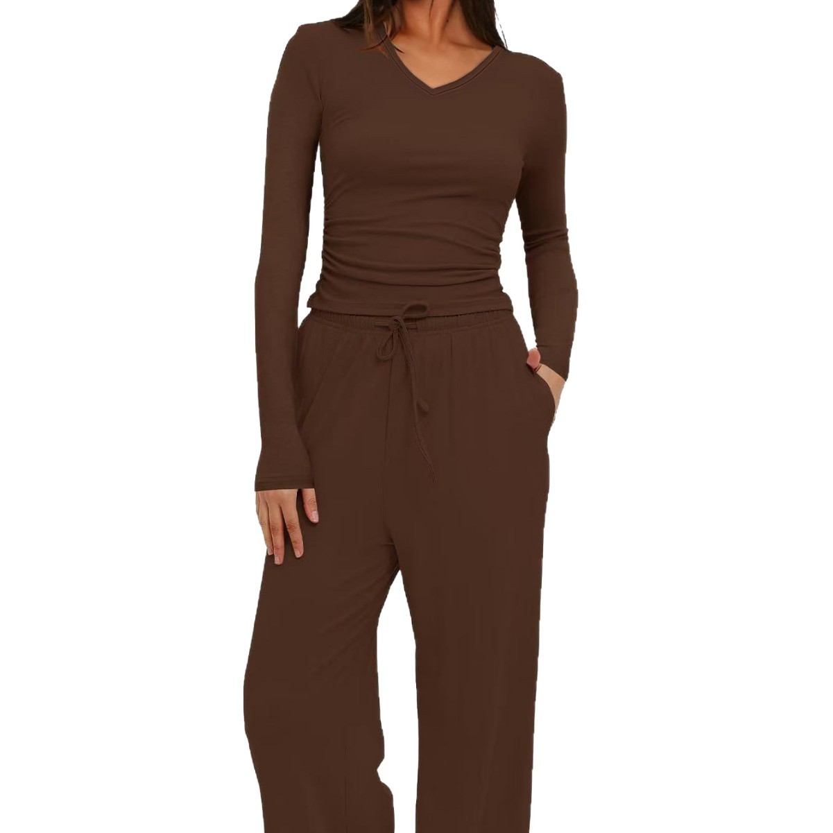 2025跨境欧美亚马逊新品纯色 休闲长袖V领套装上衣高腰阔腿裤 运