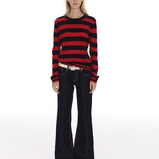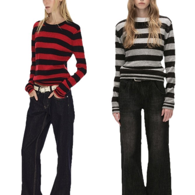 经典条纹气质针织衫毛衣女秋冬款小众修身显瘦外搭小外套弹力上衣