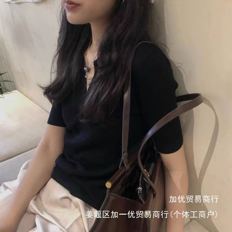 黑色v领短袖正肩T恤女夏季感修身显瘦小个子别致锁骨短款批发