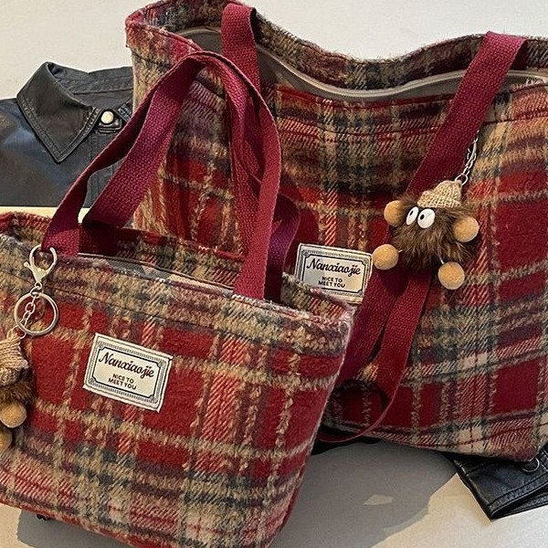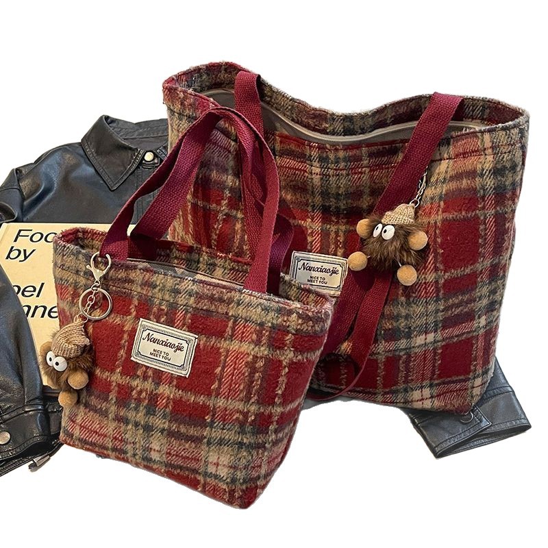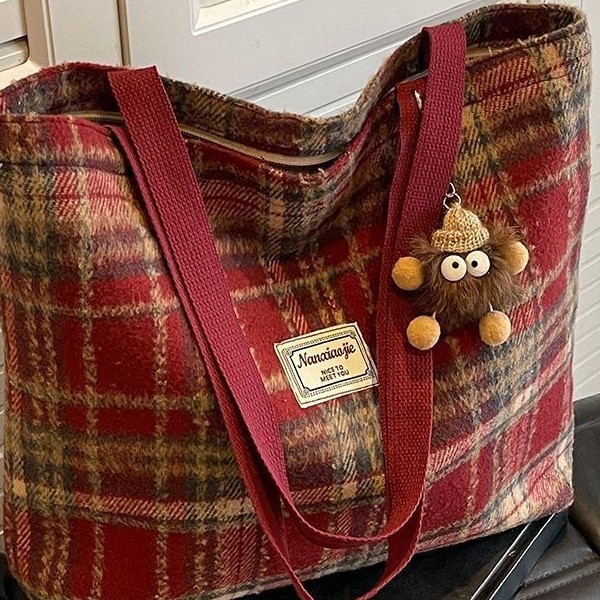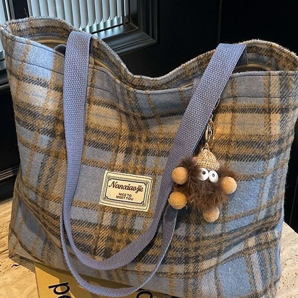 帆布大容量通勤上课格子包包2025新款秋冬复古百搭网红单肩托特包