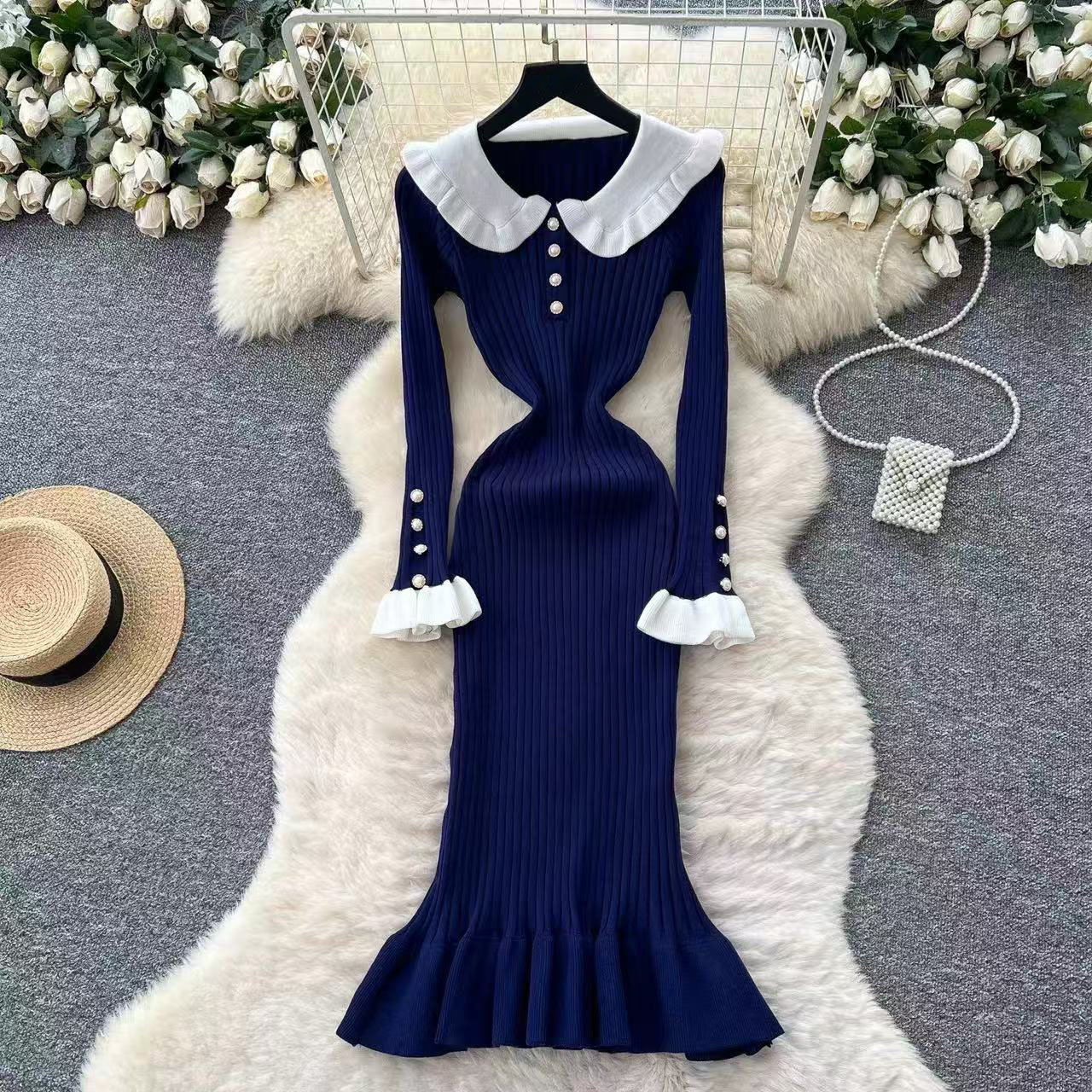 | 风格 | 温柔风 | 1 | 撞色娃娃领收腰针织弹力修身显瘦气质荷叶边长裙 |