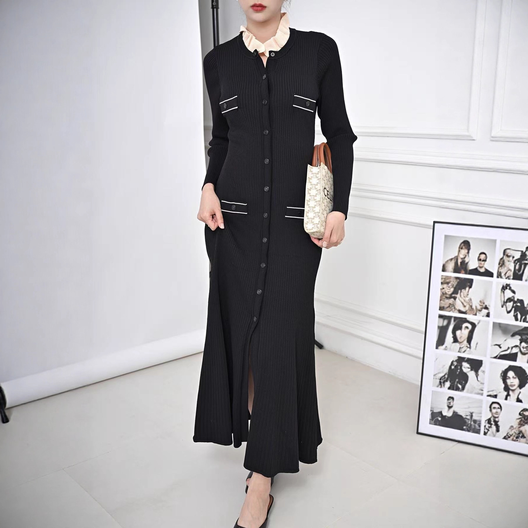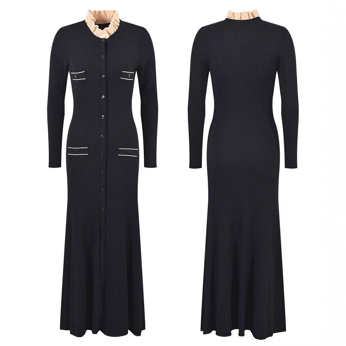 | 跨境风格类型 | 气质优雅 | 1 | 法式毛衣裙花边领黑色长裙修身显瘦针织连衣裙撞色设计长袖时尚 |