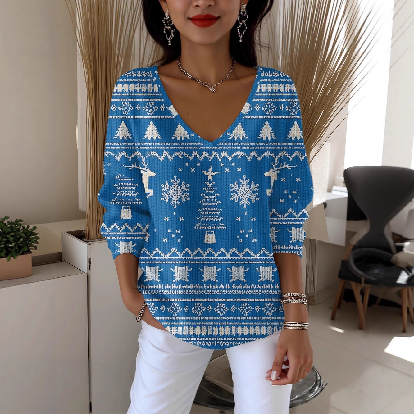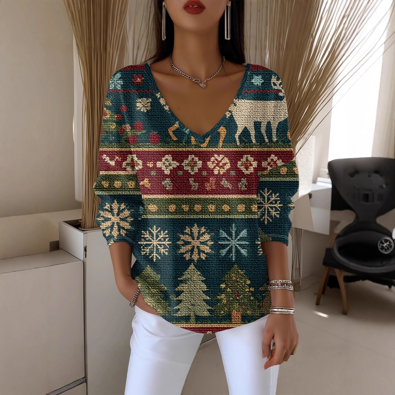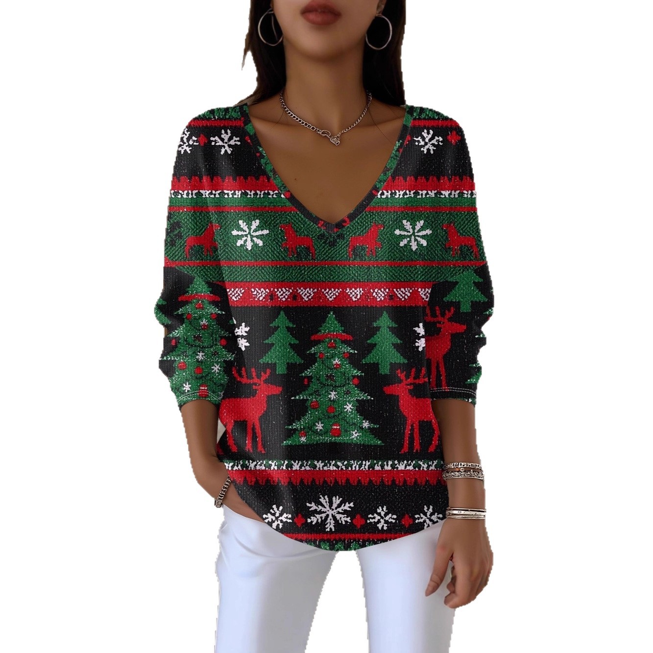 秋冬新款街头潮流数码印花圣诞创意女款V领粗针长袖圆领卫衣