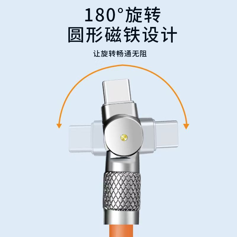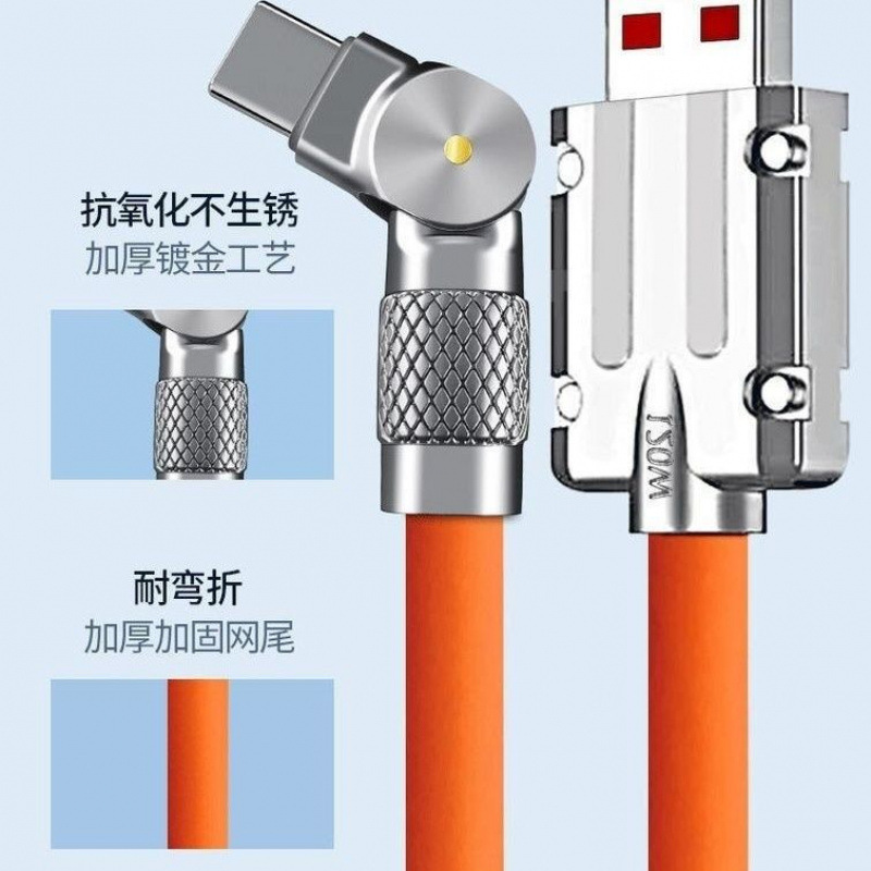 180°旋转弯头带LED灯机客线120W锌合金液态硅胶快充电线厂家批发