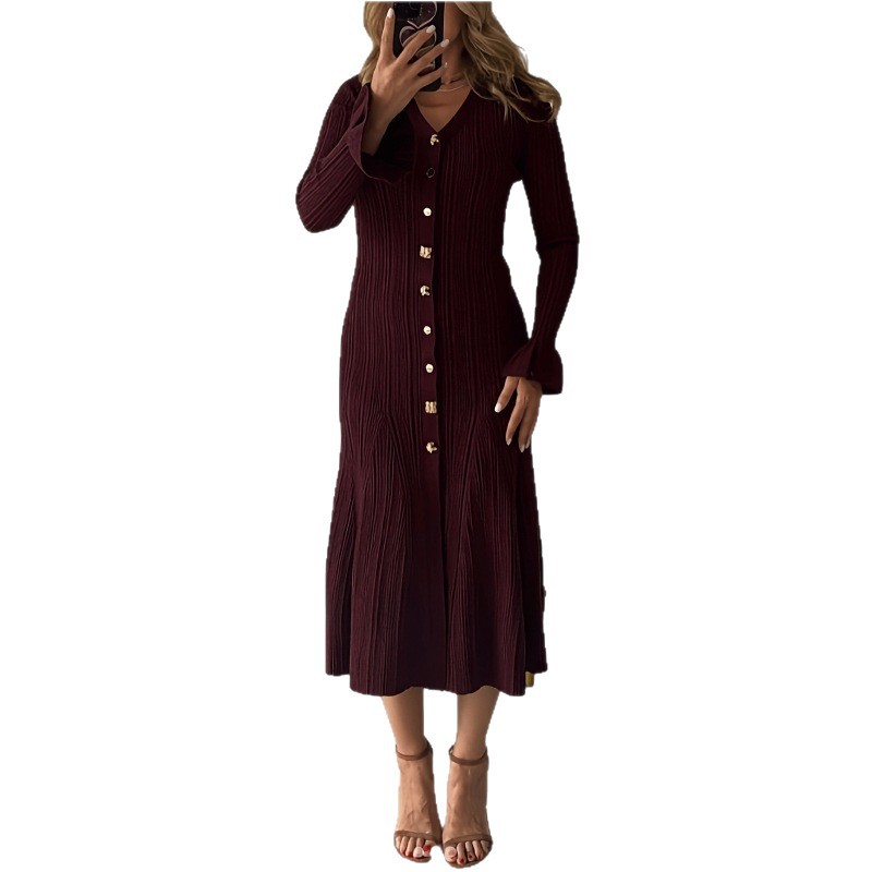 | 1 | 2025秋季新款法式名媛风细闪线V领单排扣喇叭袖修身显瘦连衣裙 | 跨境风格类型 | 气质优雅 |