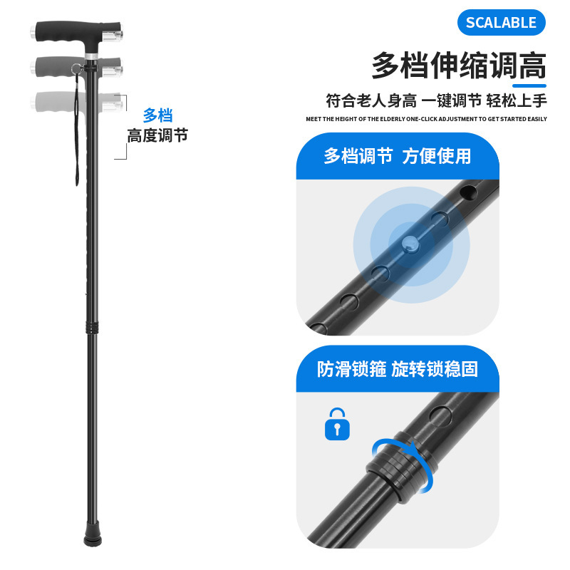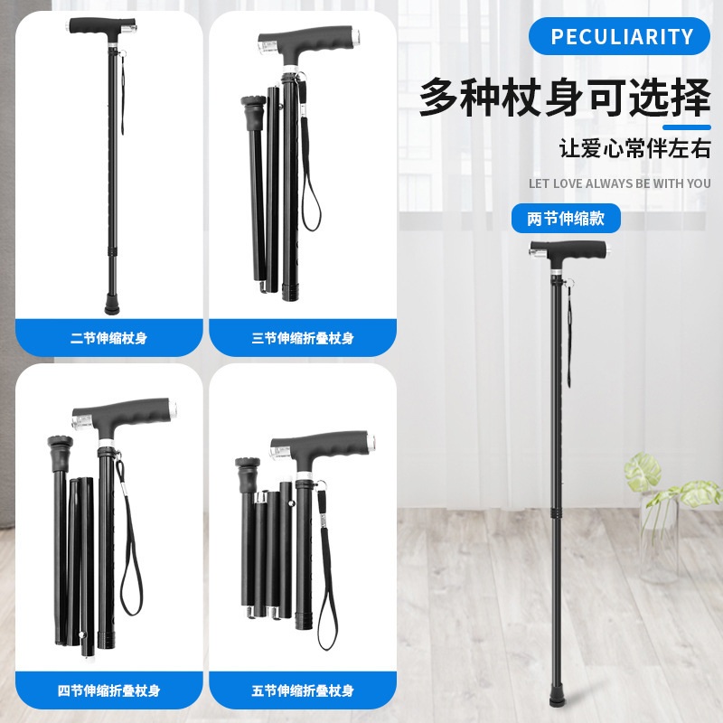 中老年人手电筒功能款老人杖铝合金拐杖老人多节伸缩拐棍厂家供应