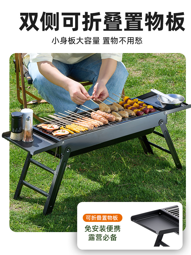 烤架/盘规格 | 加厚一体折叠【加粗不锈钢烤网】+12件套+5斤炭 | | 烤架/盘规格 | 双侧置物板【方格烤网】 |
