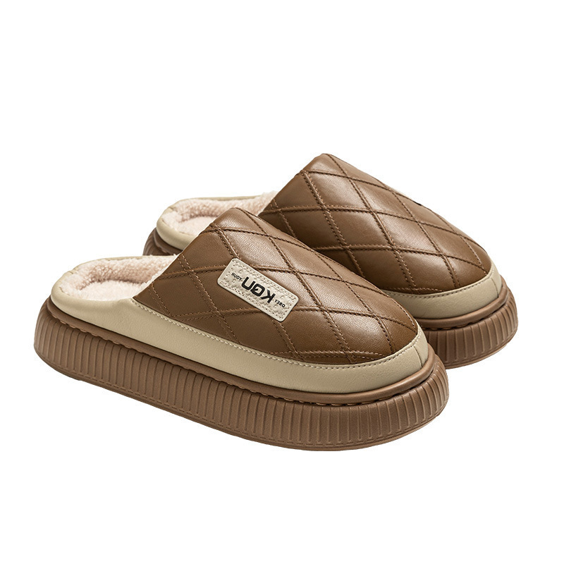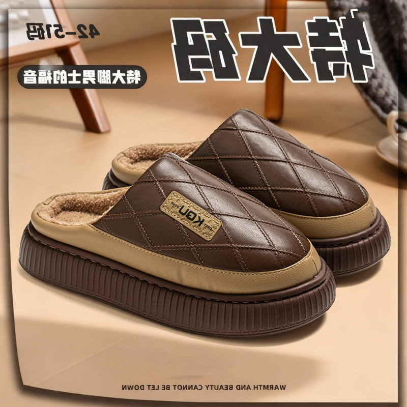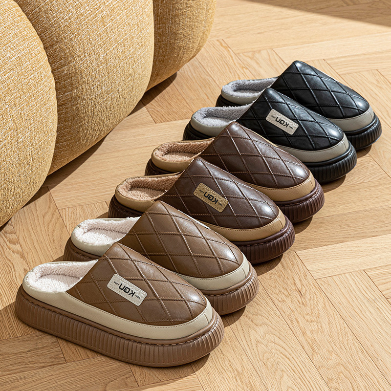 2025新款男士棉拖秋冬男PU简约菱格纹柔软舒适保暖防滑防水不臭脚