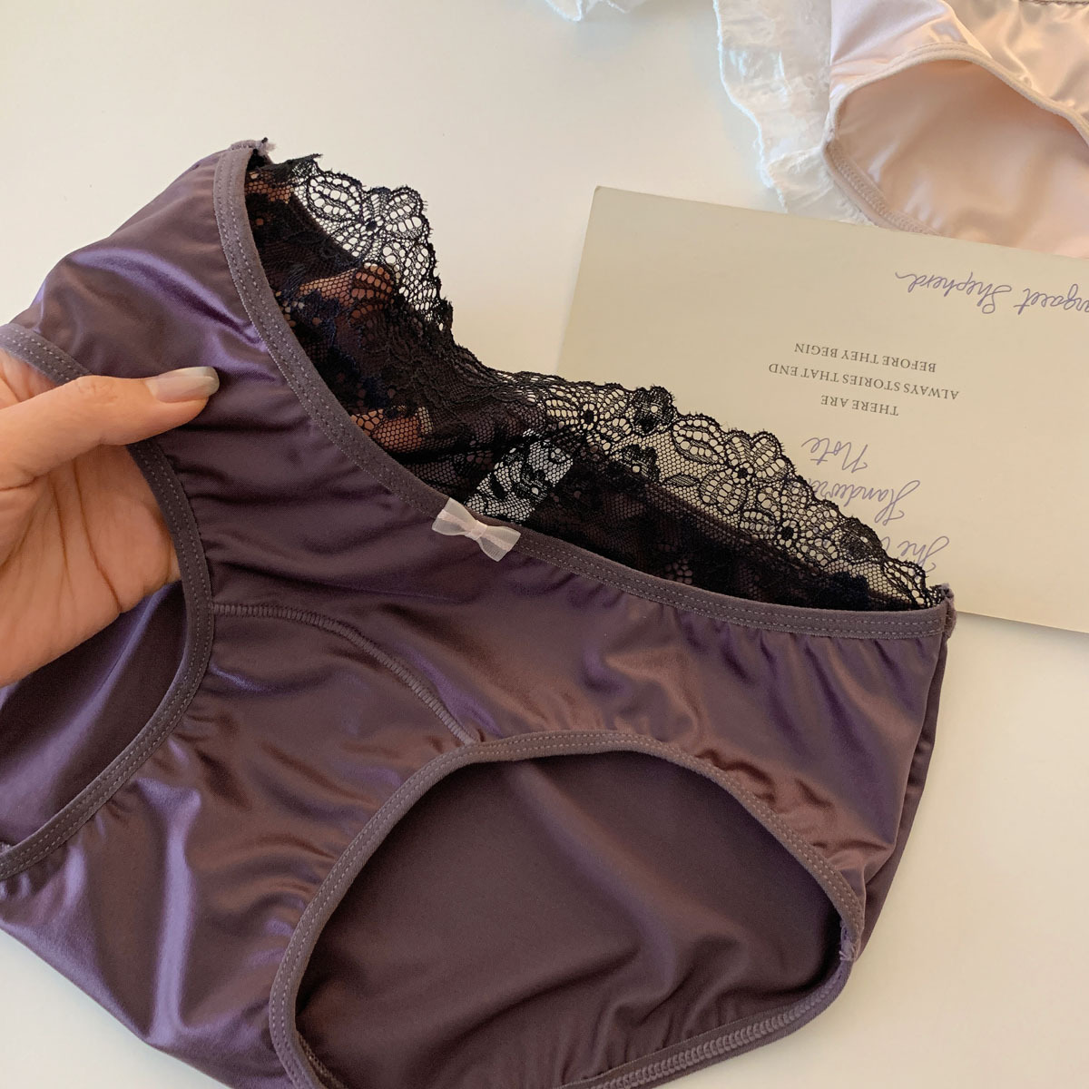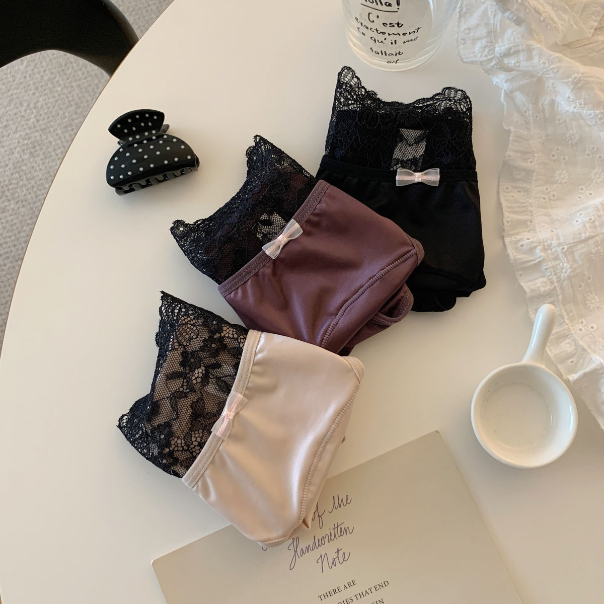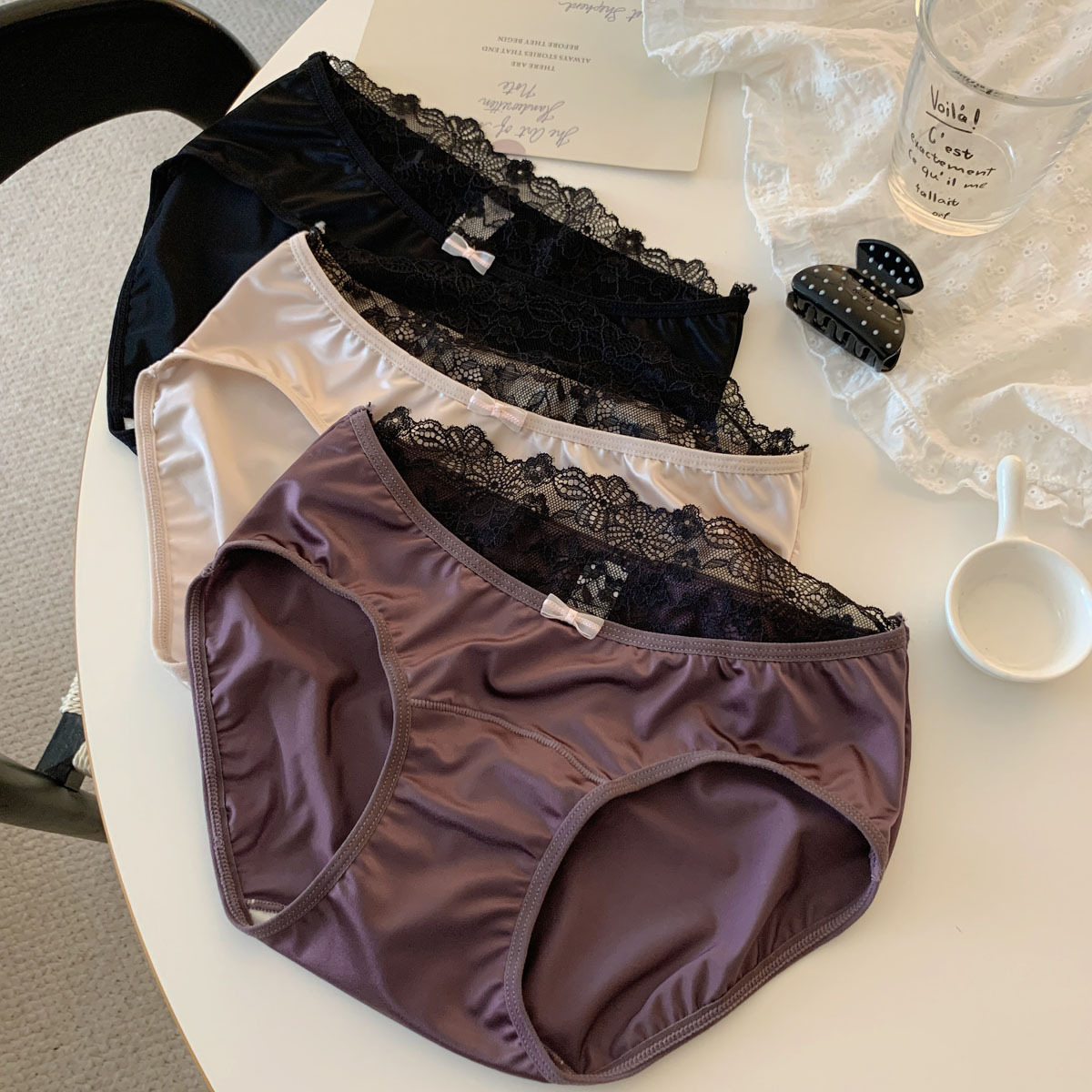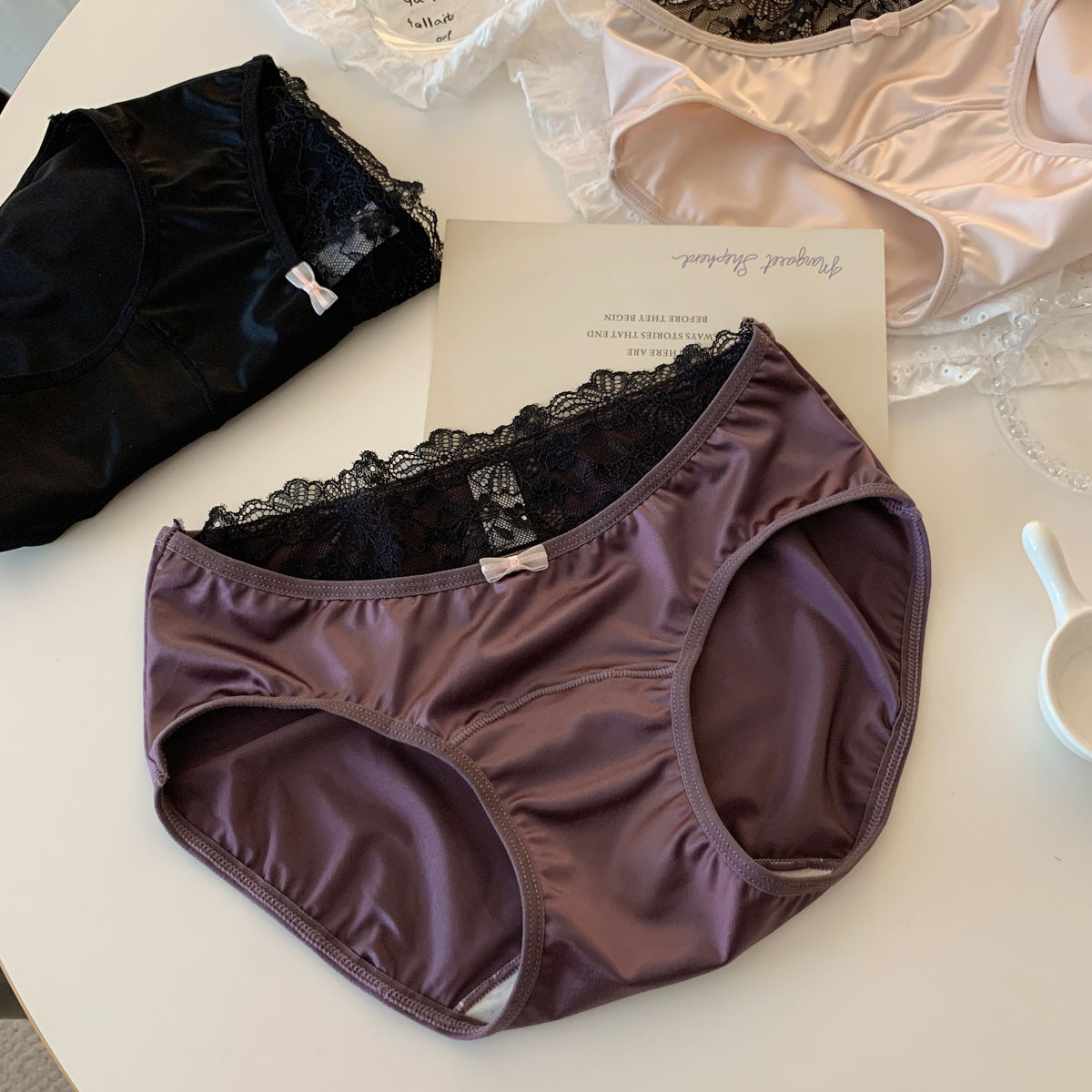 法式甜美紫色轻奢缎面纯欲蝴蝶结蕾丝内裤女性感三角裤女低腰舒适