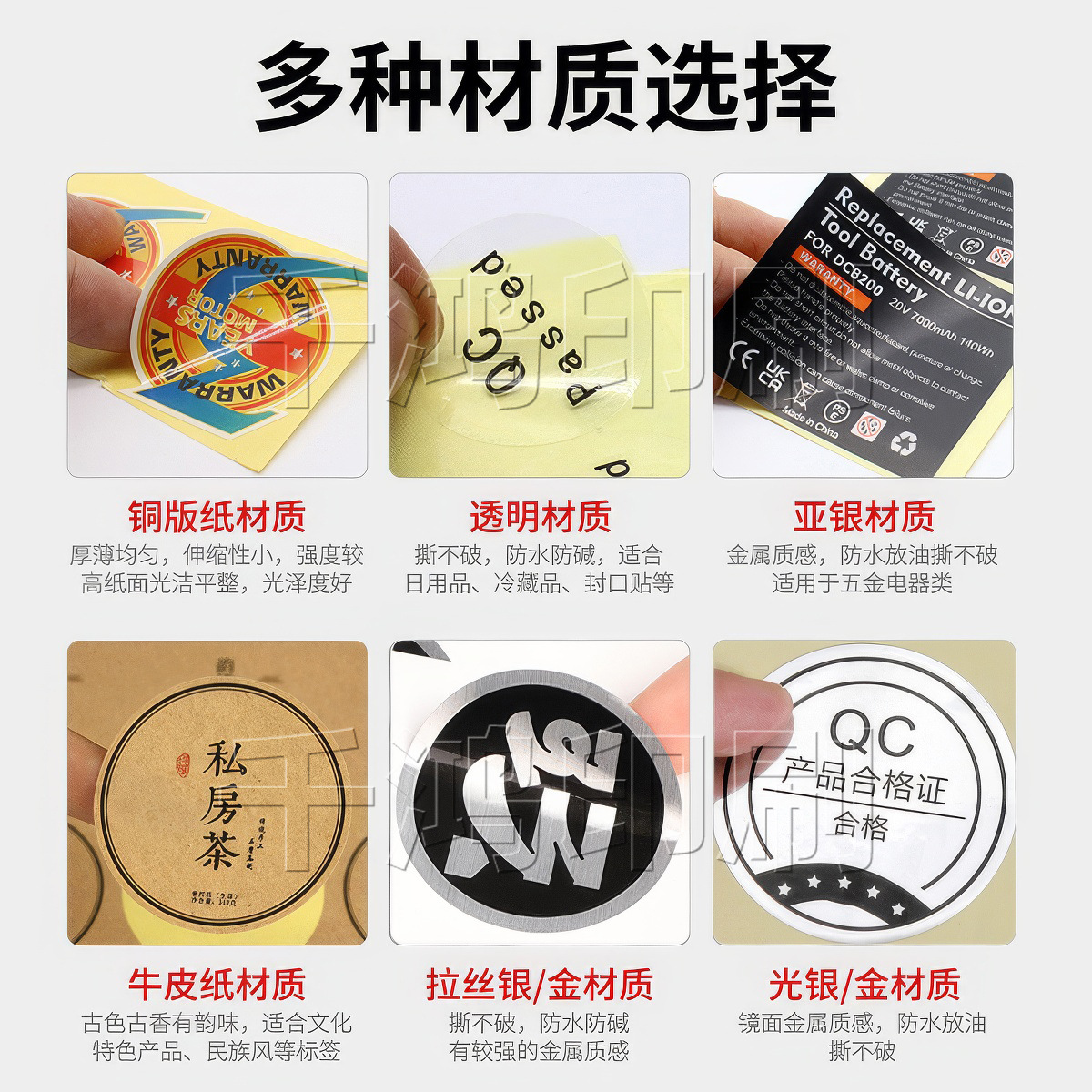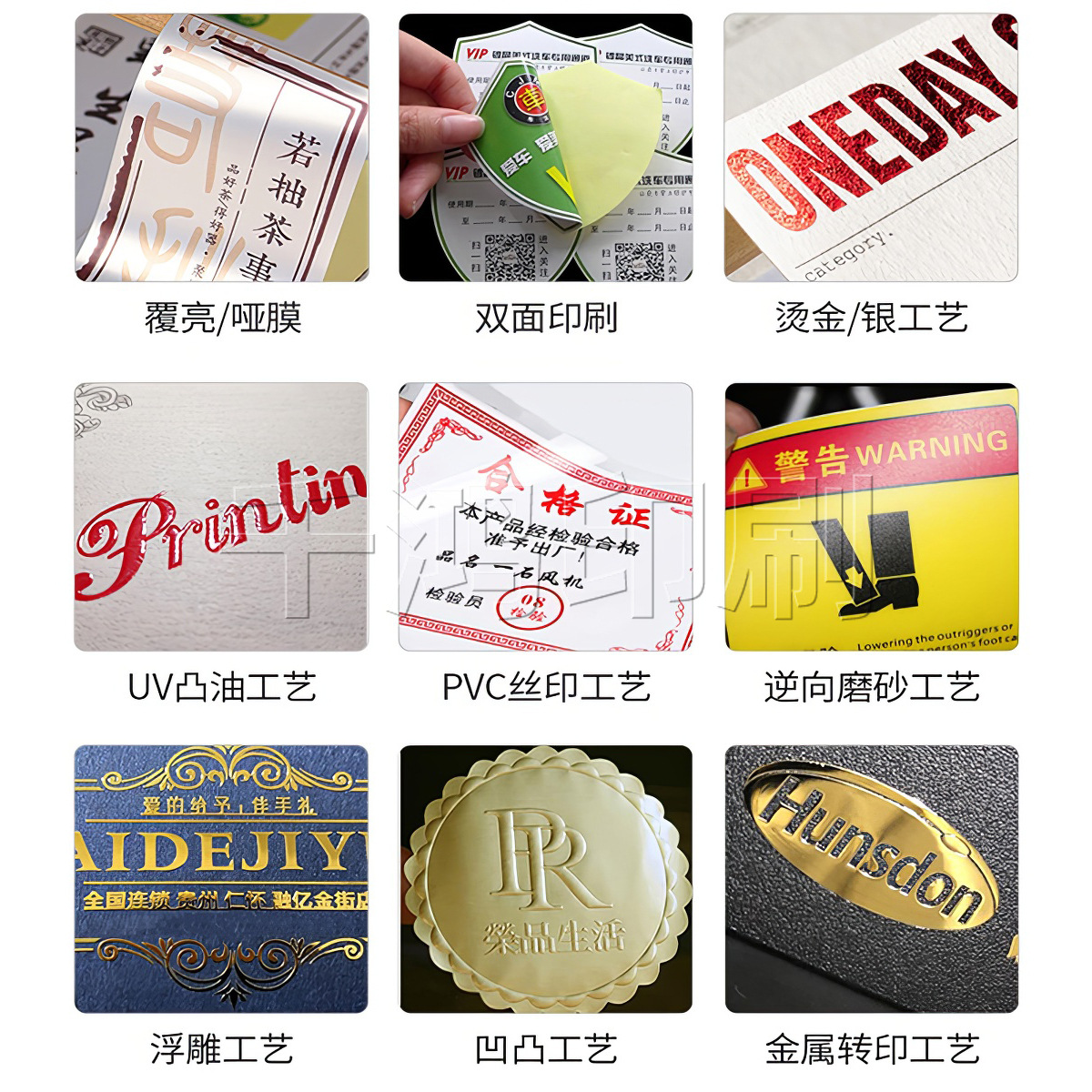| 形状 | 正方形,长方形,圆形,椭圆形,不规则形状 | 材质 | 铜版纸、易碎纸、PVC、哑银、拉丝金、牛皮纸 |