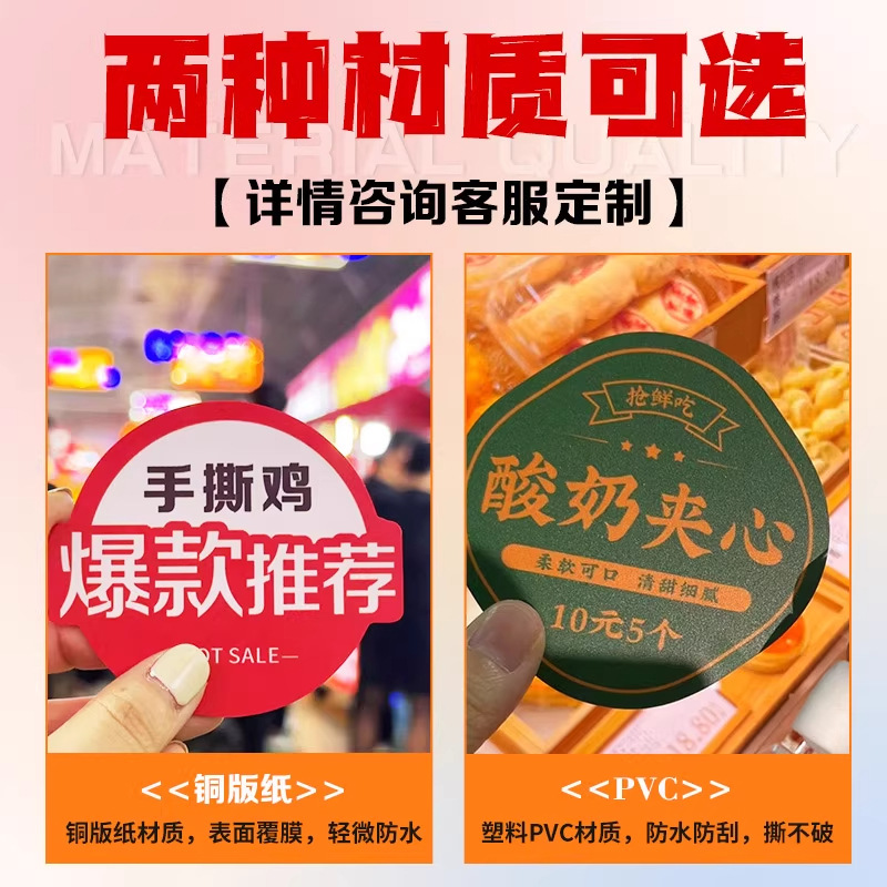 材质铜版纸、易碎纸、PVC、哑银、拉丝金、牛皮纸