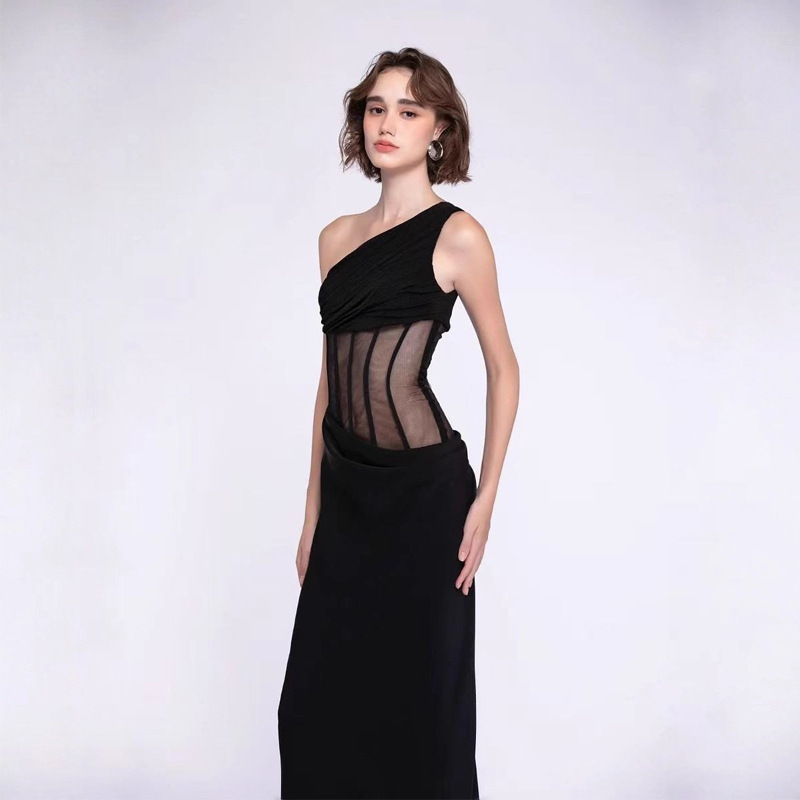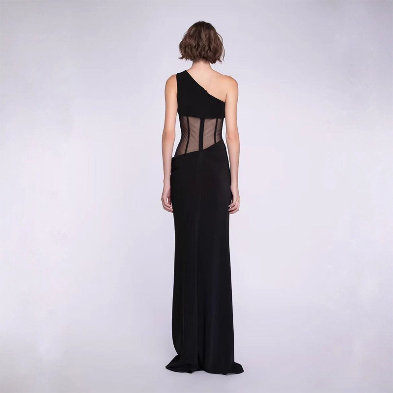 跨境欧美明星同款女装气质单肩派对晚礼服高端网纱鱼骨收腰连衣裙