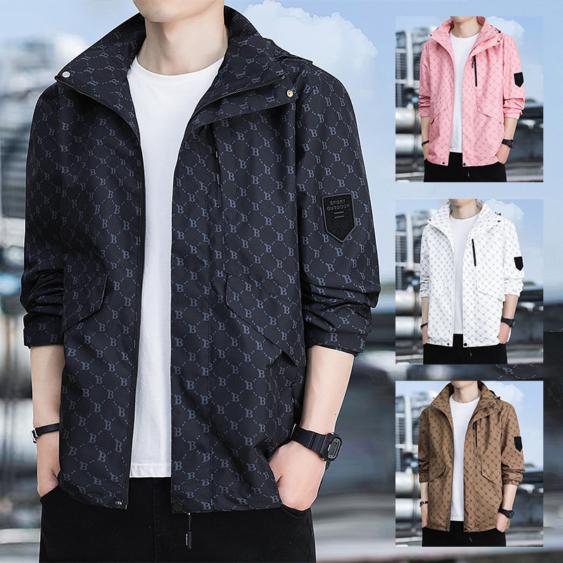夹克男春秋季新款潮流B字母连帽防风防水冲锋衣户外时尚百搭外套