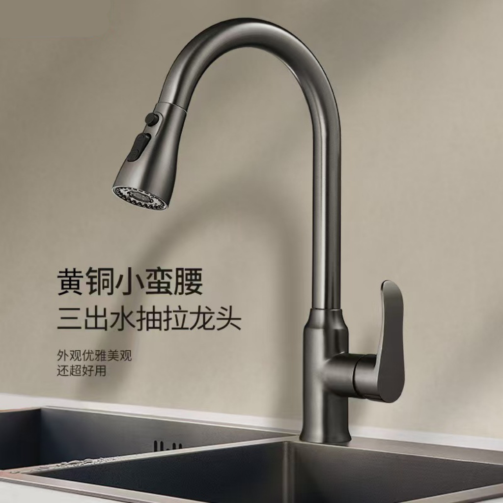 厨房枪灰色抽拉式水龙头家用万向伸缩全铜洗碗池冷热水龙头