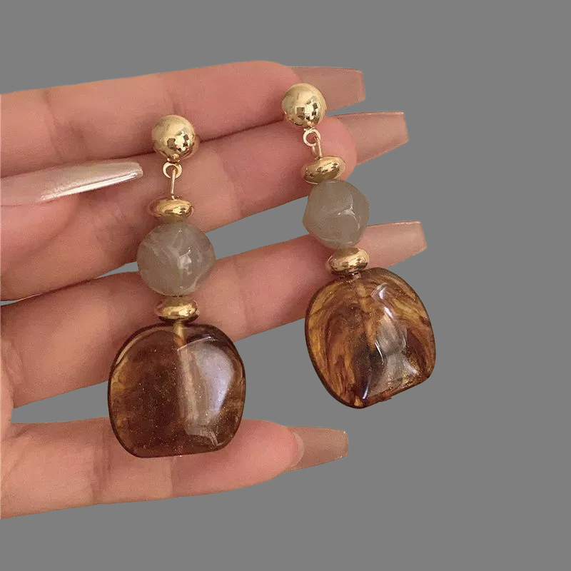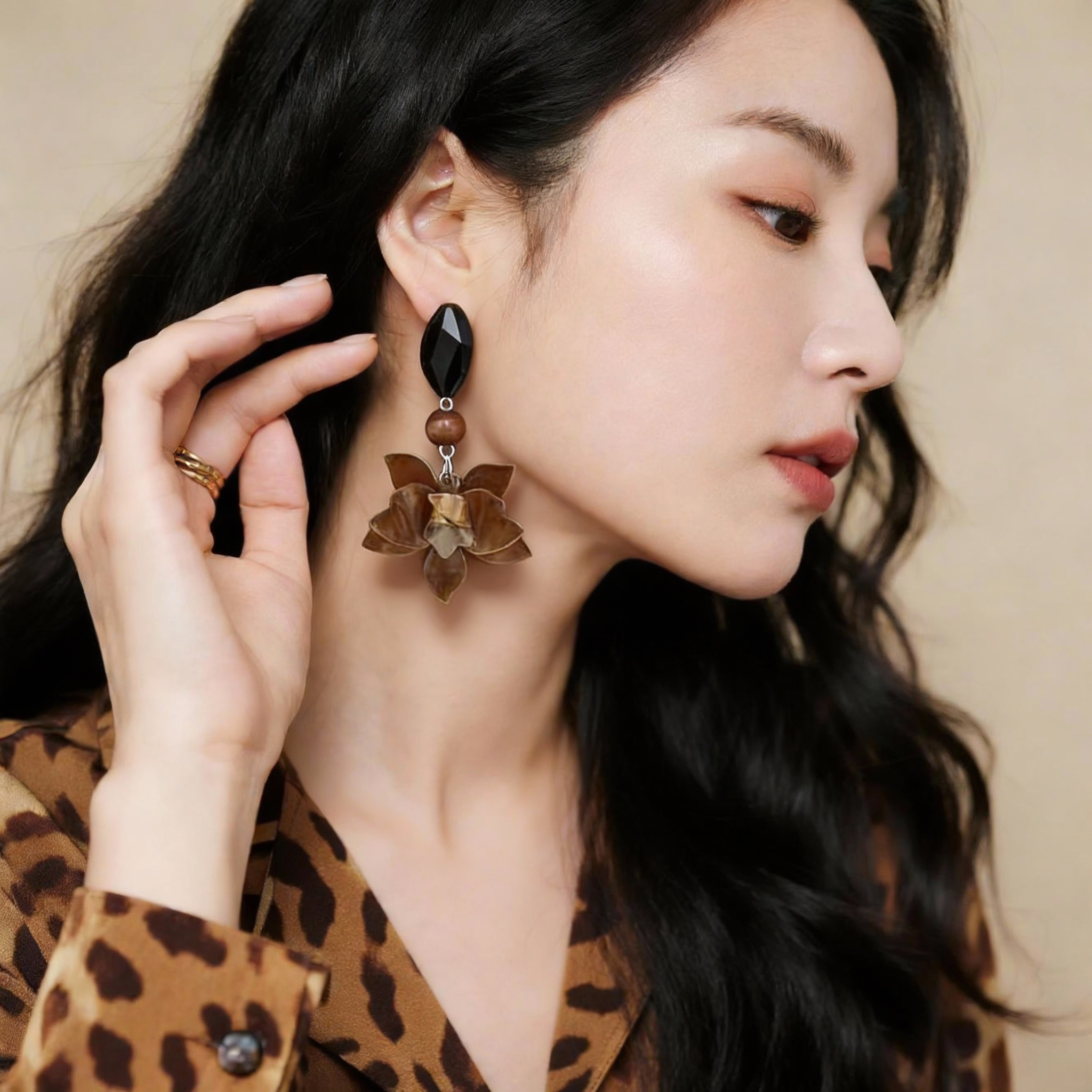 复古晕染夸张咖啡色花朵耳环优雅中式木珠咖色花瓣耳坠中古耳饰女