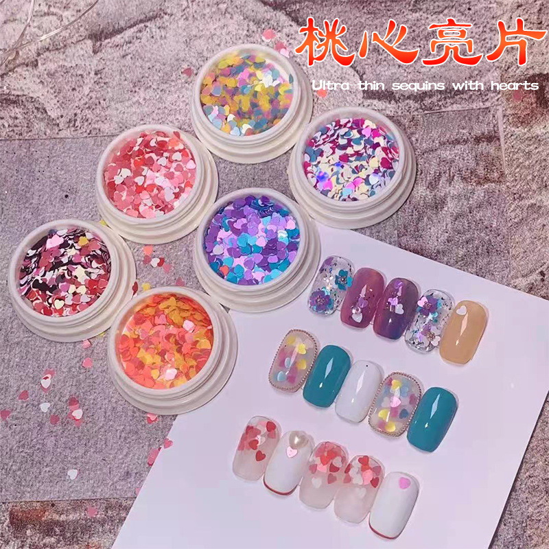 批发美甲桃心亮片爱心蝴蝶星星贴片六色镭射指甲胶饰品跨境