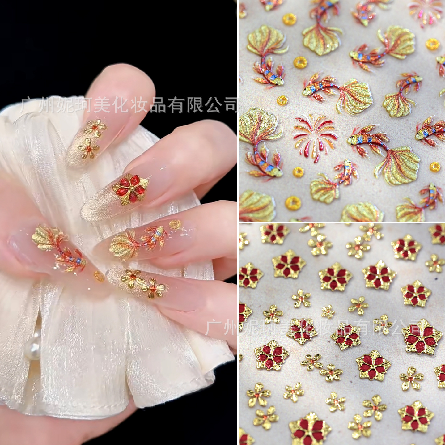 新款金鲤来财浮雕美甲贴纸烫金人间富贵金花上岸锦鲤图案网红同款