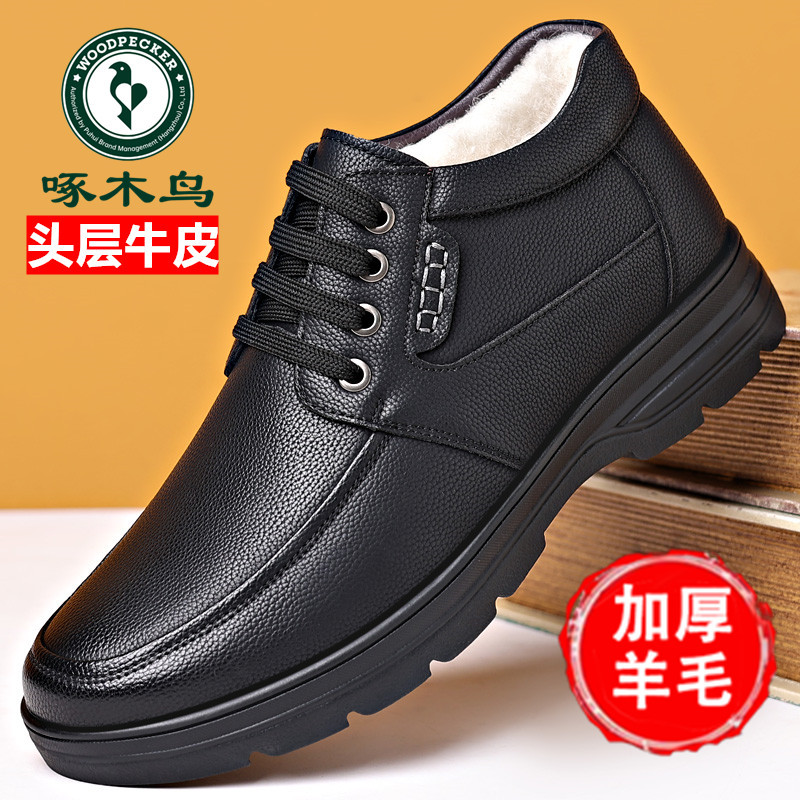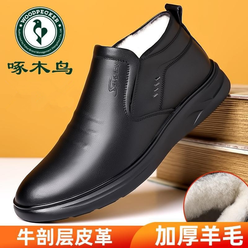 啄木鸟冬季高帮棉皮鞋男中老年真皮加绒加厚羊毛皮鞋爸爸雪地靴男
