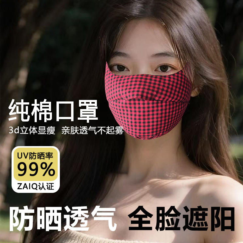 新款纯棉格子口罩3D立体防晒口罩女护眼角开口可水洗骑行透气面罩